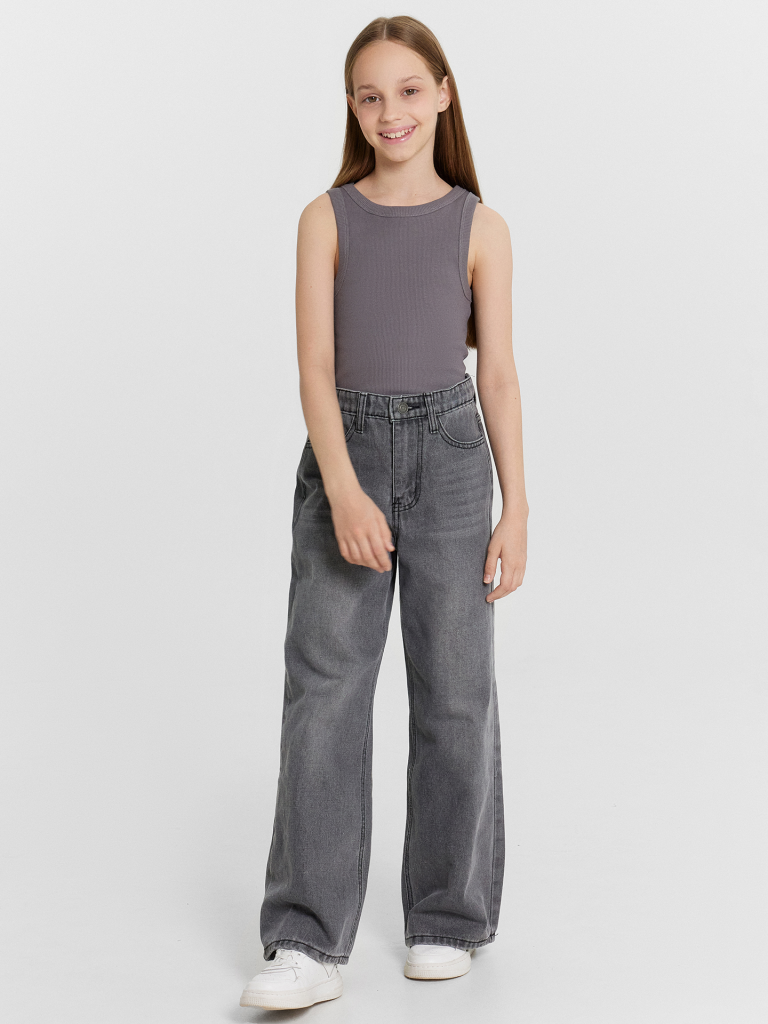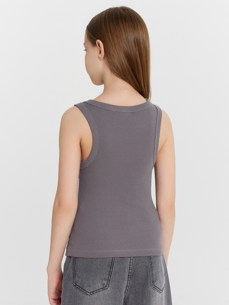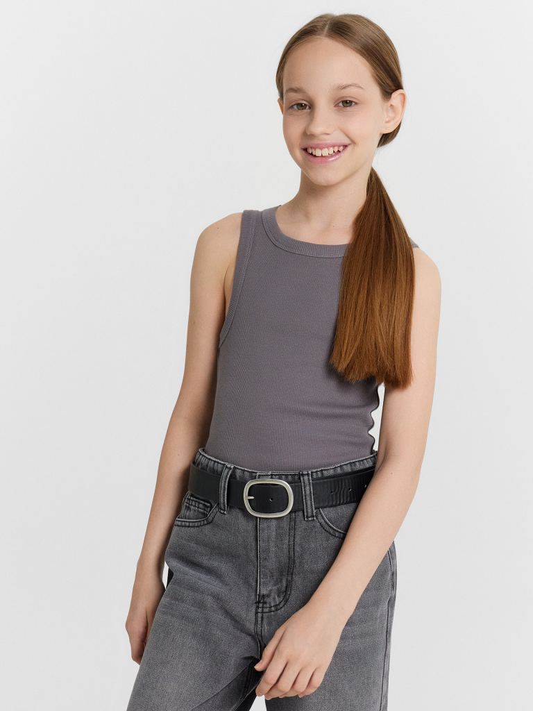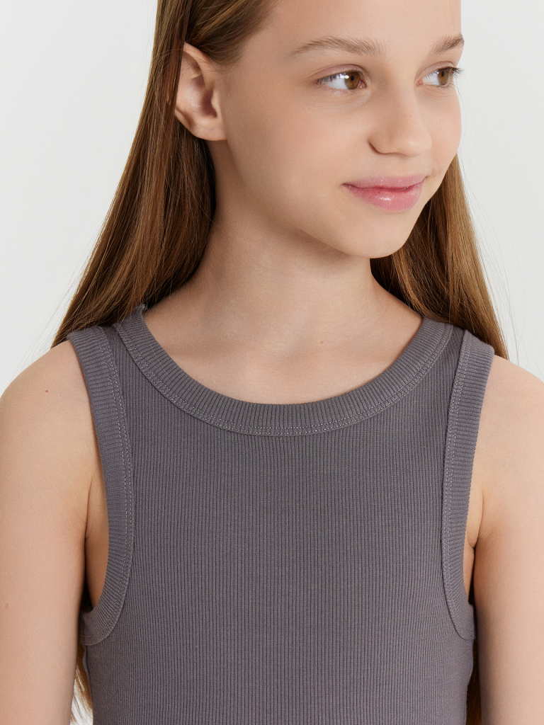 Топ для девочек из рибаны, облегающего силуэта, длиной ниже уровня талии. Перед и спинка цельнокроеные. Горловина круглая. Горловина и проймы окантованы широкой бейкой из основного полотна. Низ изделия обработан швом в подгибку.