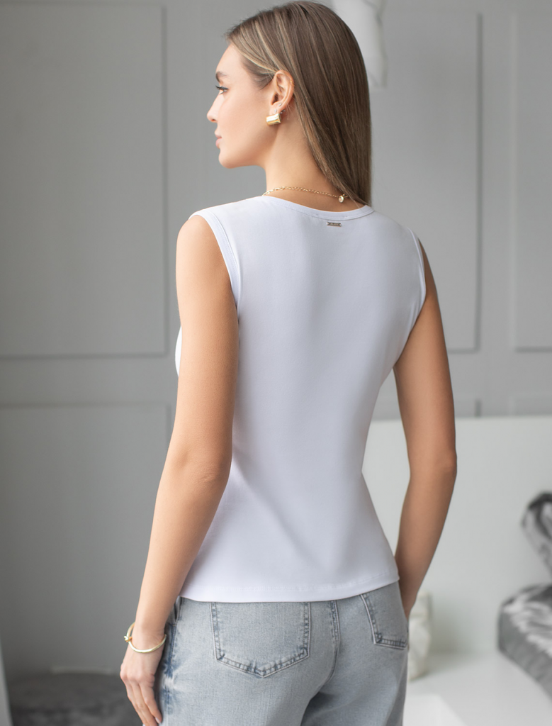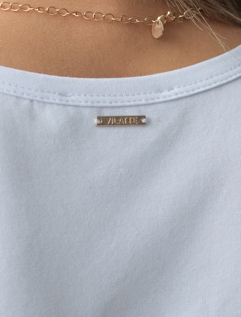 Топ выполнен из премиального хлопка с эластаном. V- вырез подчеркивает линию декольте и визуально вытягивает шею. Лаконичная базовая модель впишется в любой гардероб и дополнит многослойные образы. Материал изделия хорошо тянется и гарантирует идеальную посадку по фигуре. Из украшений только металлическим логотипом бренда.