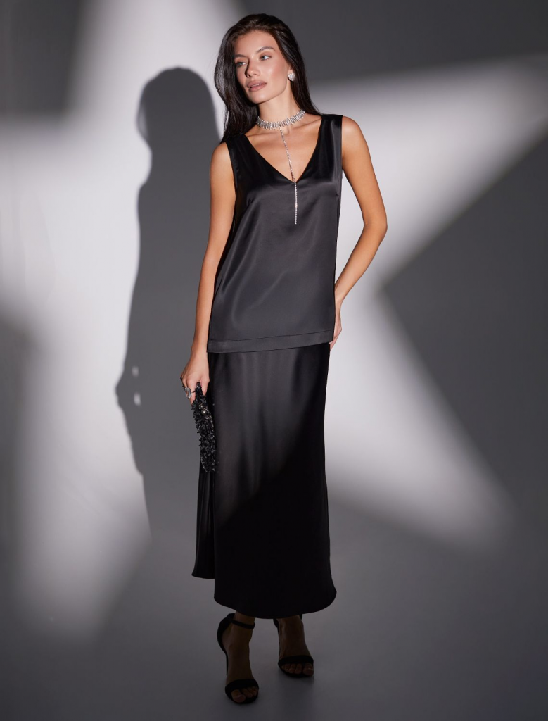Изящный нарядный топ черного цвета с V вырезом выполнен из нежного премиального сатина с небольшим добавлением эластана. Свободный крой обеспечивает комфорт, легкость и свободу движений, подчеркивая изысканность образа и женственность силуэта. Особое внимание привлекает мягкий приглушенный блеск материала, придающий топу дорогое и утонченное звучание. Материал отличается приятной текстурой и долговечностью, что гарантирует долгий срок службы топа. Благодаря струящейся, но плотной ткани, топ мягко ложится по фигуре, придавая легкость и подчеркивая достоинства любого типа фигуры. Приятная на ощупь текстура и хорошая воздухопроницаемость - делает повседневный топ отличным выбором для теплого времени года или для носки в помещении. Топ подойдет как на большие размеры, так и на маленькие — универсальность фасона позволяет чувствовать себя уверенно вне зависимости от комплекции. Декольте оформлено аккуратно, создавая эффектный акцент без излишней открытости. Этот топ идеально подойдет для создания стильного анса