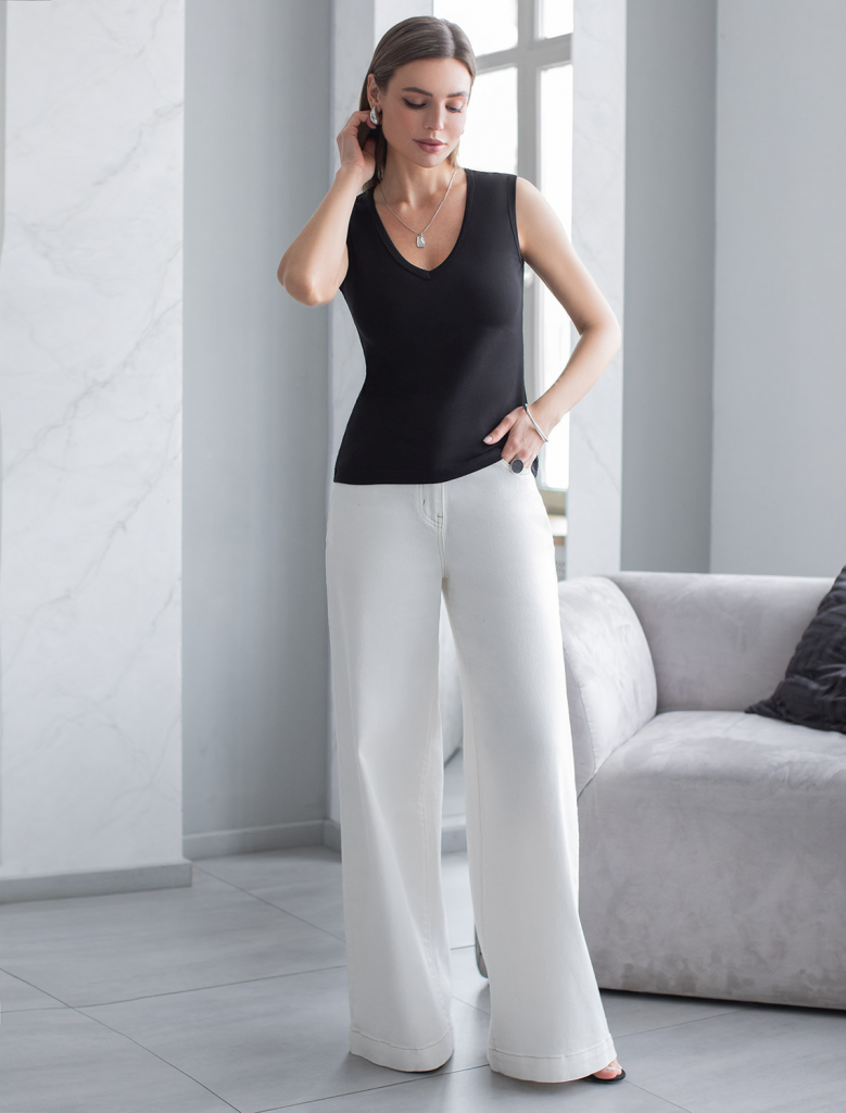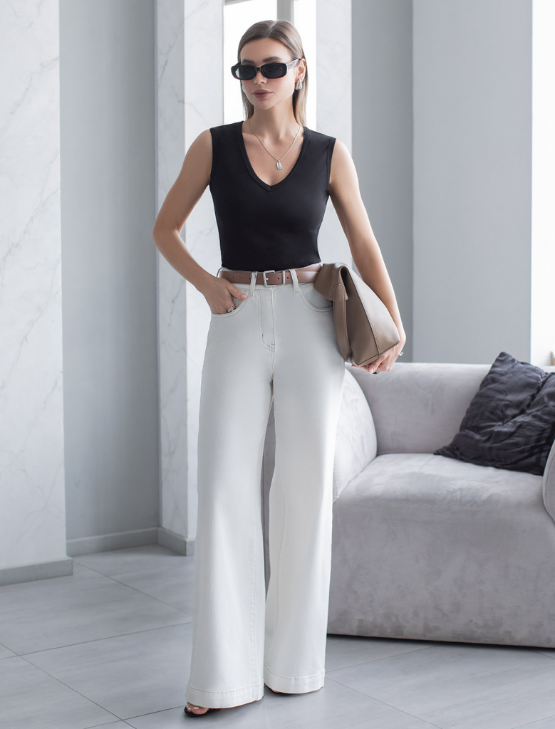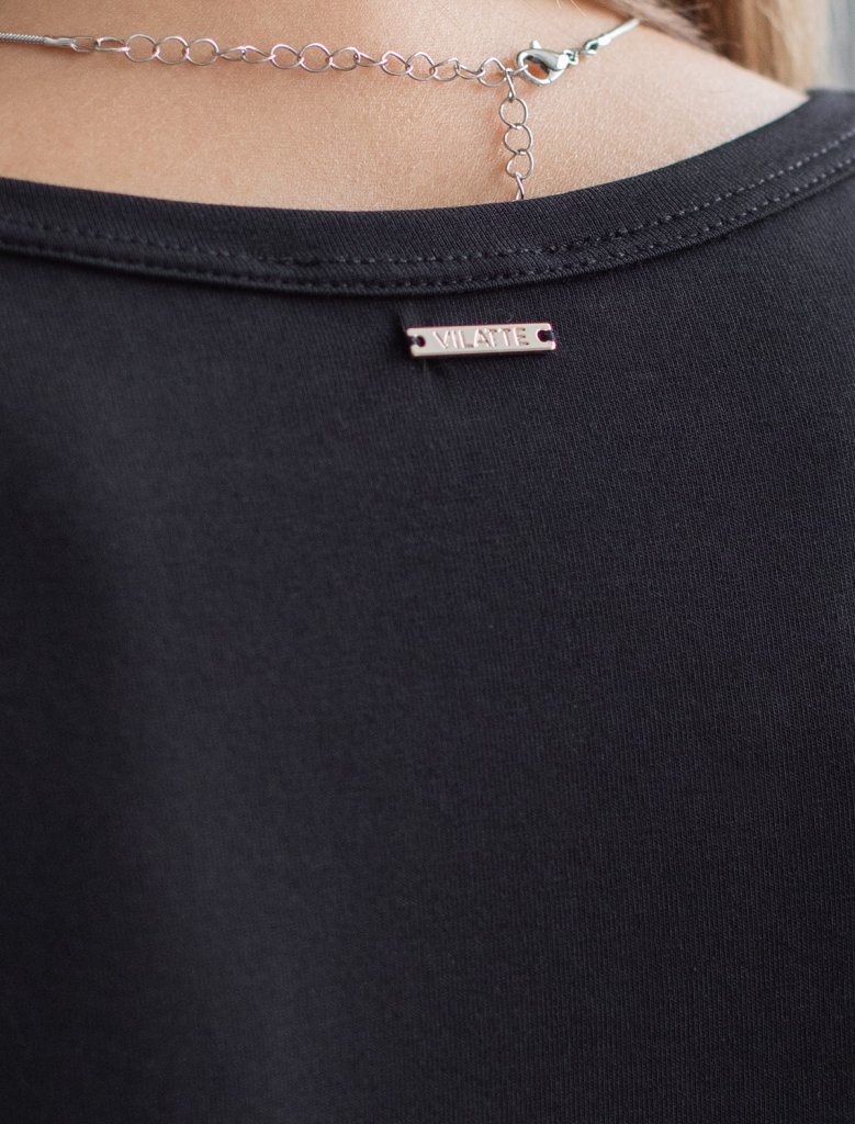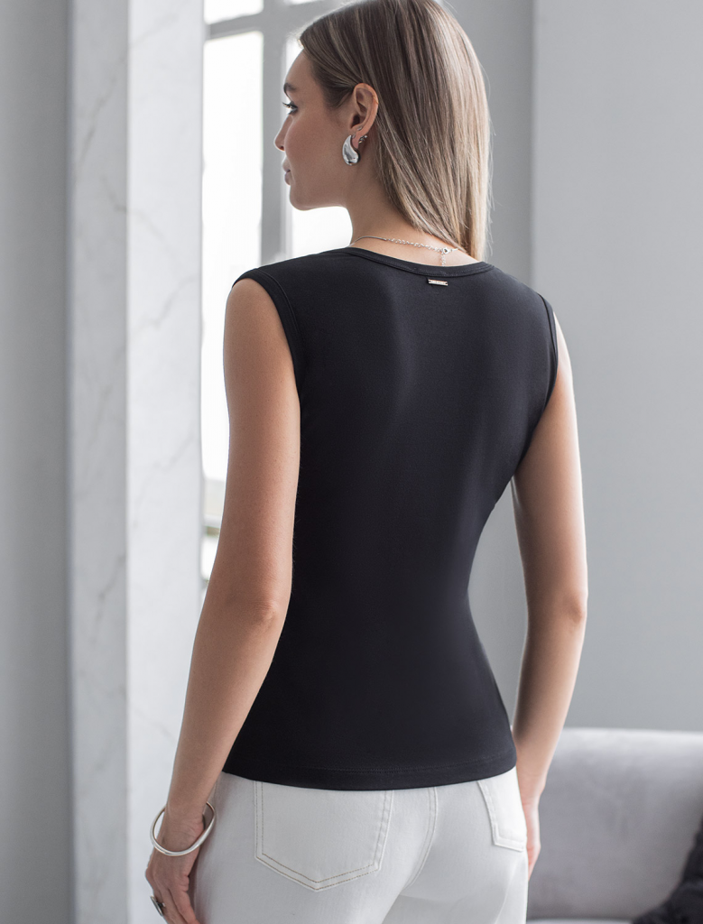 Топ выполнен из премиального хлопка с эластаном. V- вырез подчеркивает линию декольте и визуально вытягивает шею. Лаконичная базовая модель впишется в любой гардероб и дополнит многослойные образы. Материал изделия хорошо тянется и гарантирует идеальную посадку по фигуре. Из украшений только металлическим логотипом бренда.