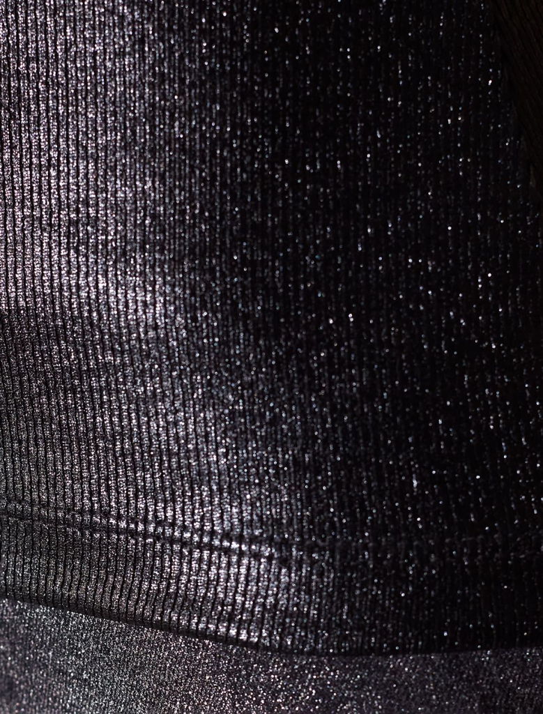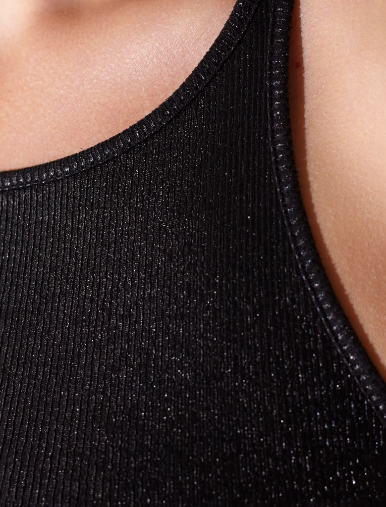 Эффектный топ черного цвета из мягкого хлопка с эластаном представлен в стильном исполнении с матовым покрытием металлик. Мелкий рубчик визуально вытягивает силуэт и подчеркивает фигуру, делая образ более стройным и аккуратным. Круглый ворот и суженные лямки акцентируют внимание на линии ключиц, делая образ утонченным и изысканным, Благодаря деликатному блеску топ подходит для тех, кто ценит утонченность и стремится добавить в образ немного сияния без перебора - это отличный вариант топа для любительниц минимализма.Натуральный дышащий материал обеспечивает комфортный микроклимат на протяжении всего дня, не вызывая дискомфорта даже при длительном ношении. Износостойкое покрытие сохраняет блеск и привлекательность майки несмотря на частое использование. Топ прекрасно сочетается с деловым костюмом или аксессуарами, позволяя создавать как строгие, так и вечерние образы.