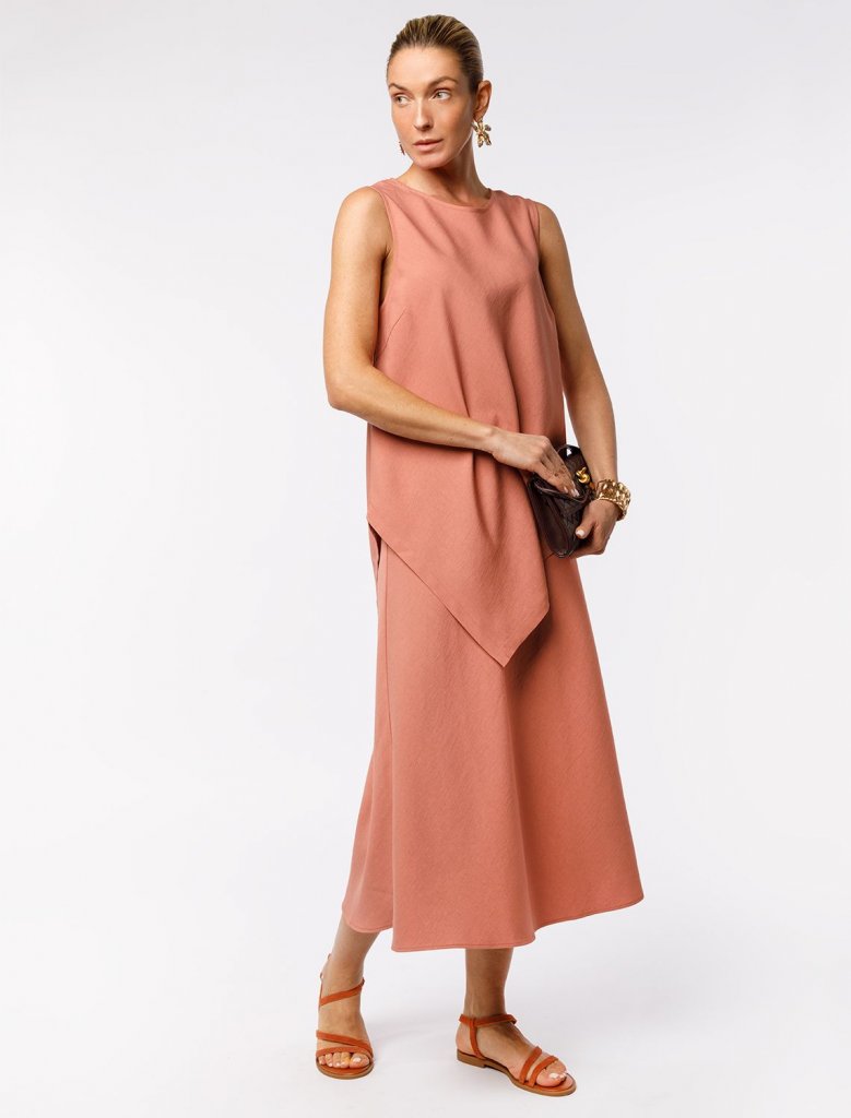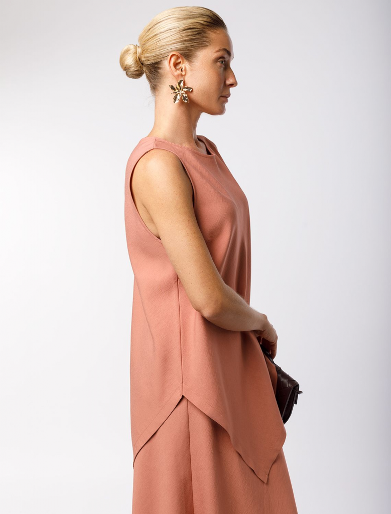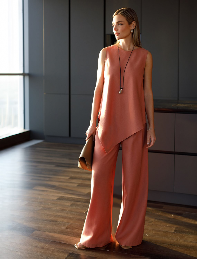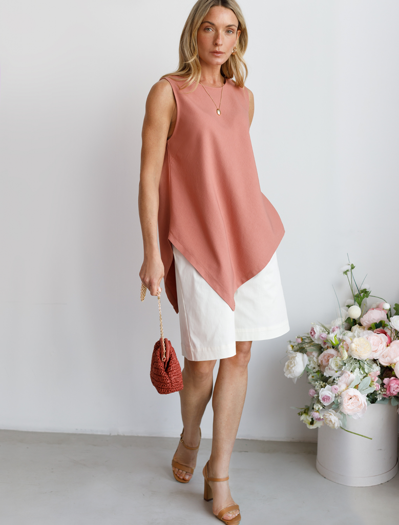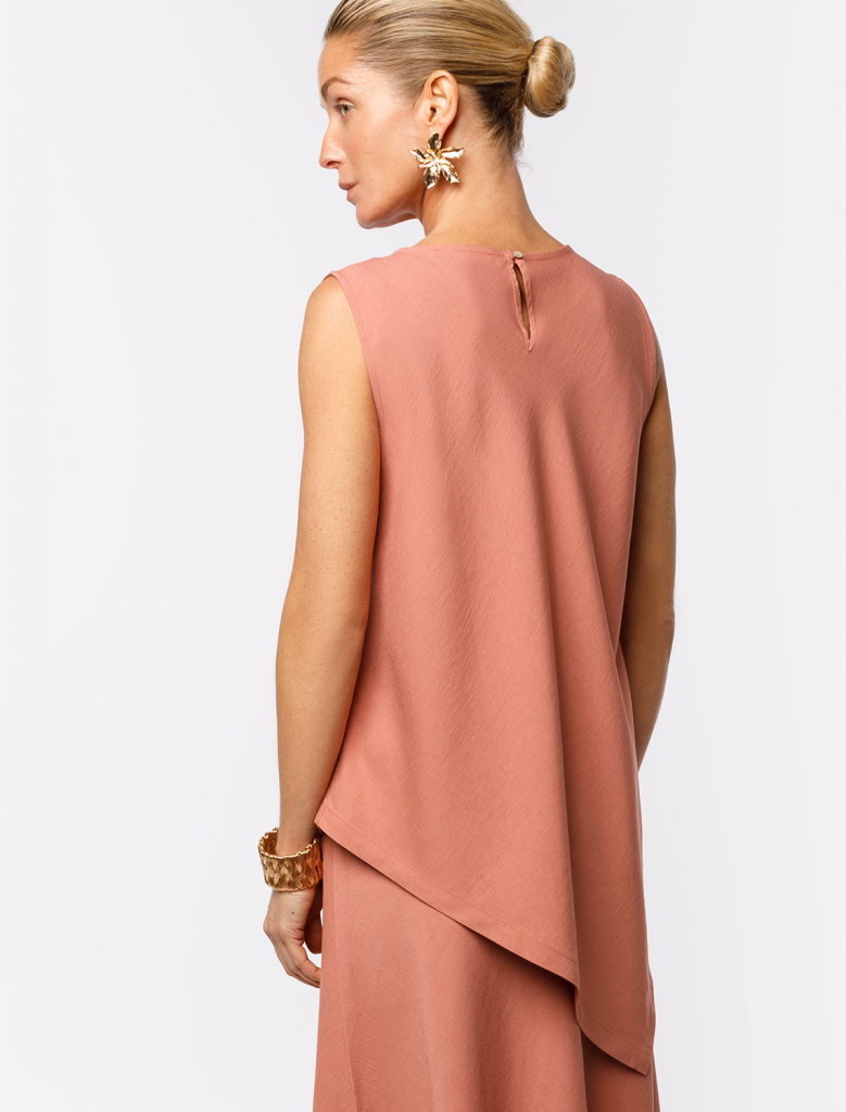 Топ выполнен из плотного лиоцелла. Удлиненная модель с трендовым ассиметричным низом. Ткань изделия отлично держит форму, плавно драпируется и не просвечивает. В теплое время года приятно охлаждает кожу. Добавление синтетических волокон в составе изделия, предотвращает сминаемостьи поддерживает формоустойчивость. Топ сочетается в костюме с брюками D24.261, D24.265, D24.267, юбкой D24.261, шортами D28.057, а также очень эффектно с белыми шортами и джинсами.