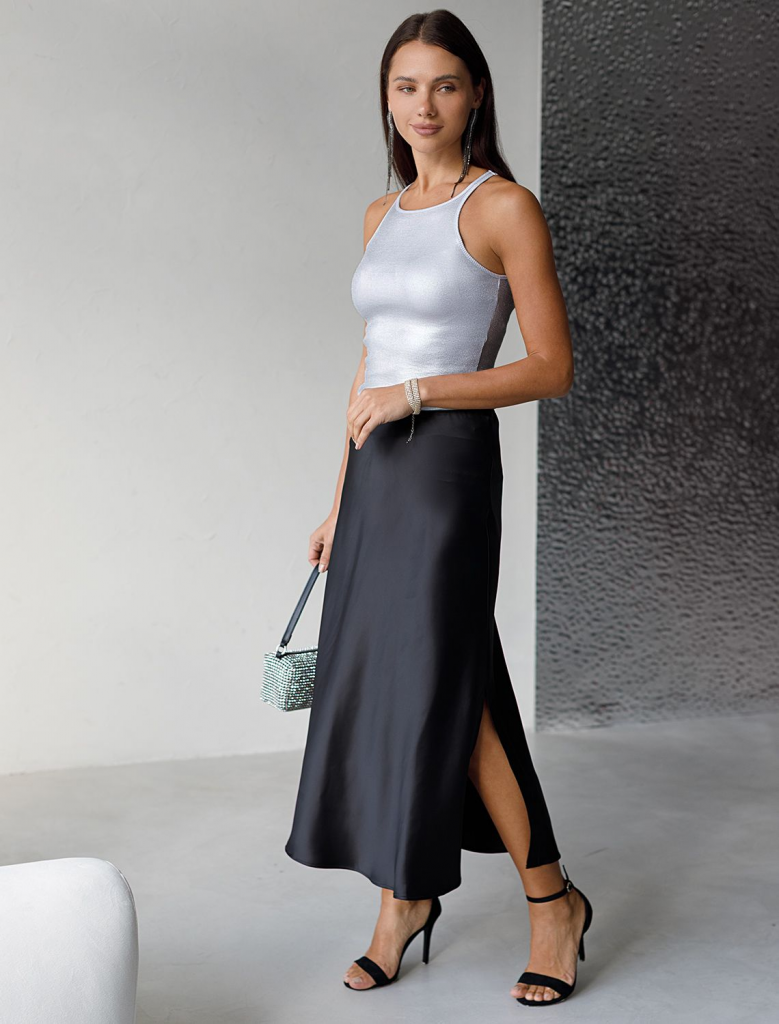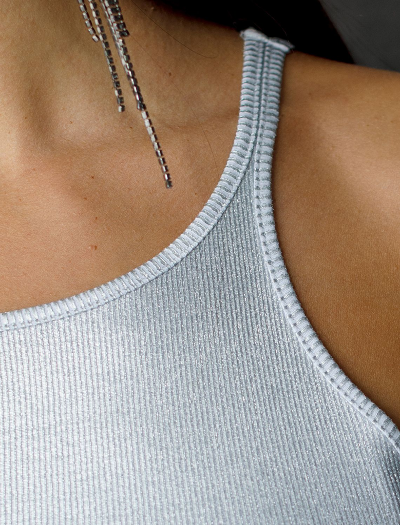 Эффектный топ серебристого цвета из мягкого хлопка с эластаном представлен в стильном исполнении с матовым покрытием металлик. Мелкий рубчик визуально вытягивает силуэт и подчеркивает фигуру, делая образ более стройным и аккуратным. Круглый ворот и суженные лямки акцентируют внимание на линии ключиц, делая образ утонченным и изысканным, Благодаря деликатному блеску топ подходит для тех, кто ценит утонченность и стремится добавить в образ немного сияния без перебора - это отличный вариант топа для любительниц минимализма.Натуральный дышащий материал обеспечивает комфортный микроклимат на протяжении всего дня, не вызывая дискомфорта даже при длительном ношении. Износостойкое покрытие сохраняет блеск и привлекательность майки несмотря на частое использование. Топ прекрасно сочетается с деловым костюмом или аксессуарами, позволяя создавать как строгие, так и вечерние образы.