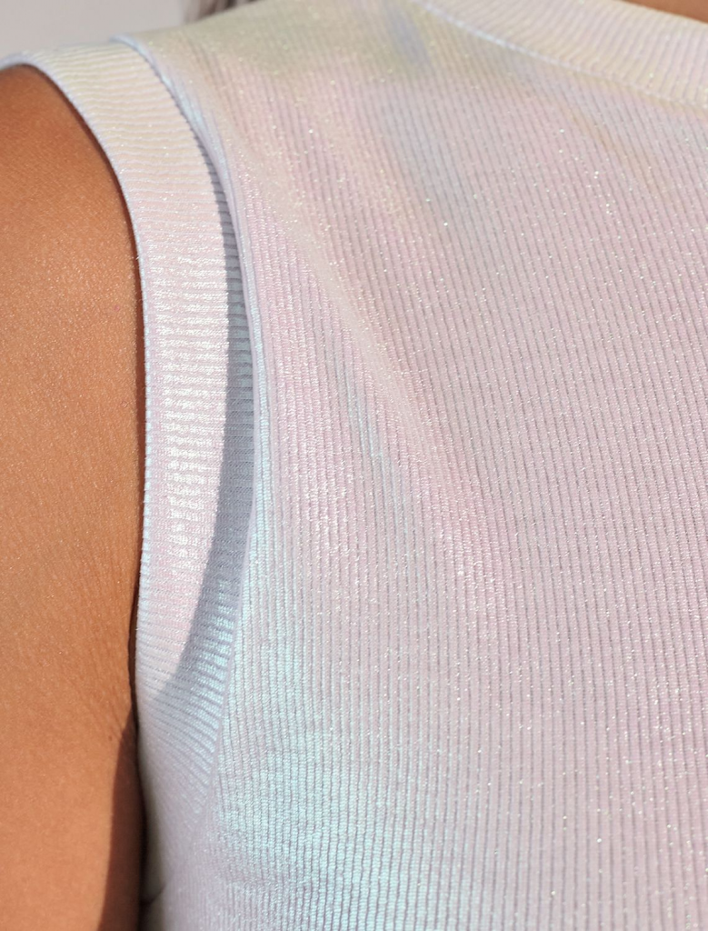 Эффектный топ перламутрового цвета с закрытым декольте идеально подходит для офиса, вечерних мероприятий и повседневной носки. Качественный материал содержит натуральный хлопок, благодаря чему ткань мягкая, дышащая и приятная на ощупь. Добавление эластана обеспечивает эластичность и позволяет изделию хорошо садиться на любую фигуру, в том числе и большие размеры. Ткань в мелкий рубчик вытягивает силуэт. Формоустойчивость материала сохраняет аккуратный внешний облик даже после многочисленных стирок.Трендовый матовый металлизированный эффект создает сияющий блеск без излишней яркости — это делает топ нарядным и красивым как для праздничного события, так и для повседневной носки в комплекте с деловым костюмом или джинсами. Широкие лямки обеспечивают дополнительный комфорт в течение всего дня. Круглый ворот подчеркивает линию шеи, добавляя образу изысканности.
