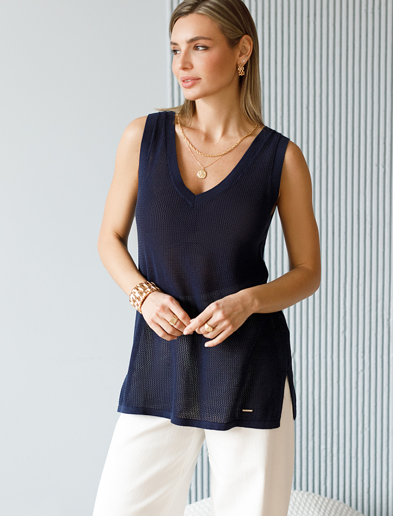 Летний топ полупрозрачной вязки выполнен из хлопковой пряжи. Идеально подойдет в жару, с мини-топом или в сочетании с купальником. Также отлично впишется в многослойные образы с джинсами и жакетом. Модель дополнена металлическим логотипом бренда.