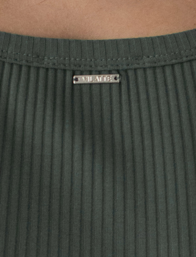 Топ выполнен из трикотажа в широкий рубчик. Эластичный хлопковый трикотаж сидит по фигуре, не сковывает движений и очень комфортный в носке. Фактура вертикальных полос визуально стройнит и вытягивает силуэт. Базовое изделие хорошо впишется в любой гардероб. Идеально подходит для многослойных образов.