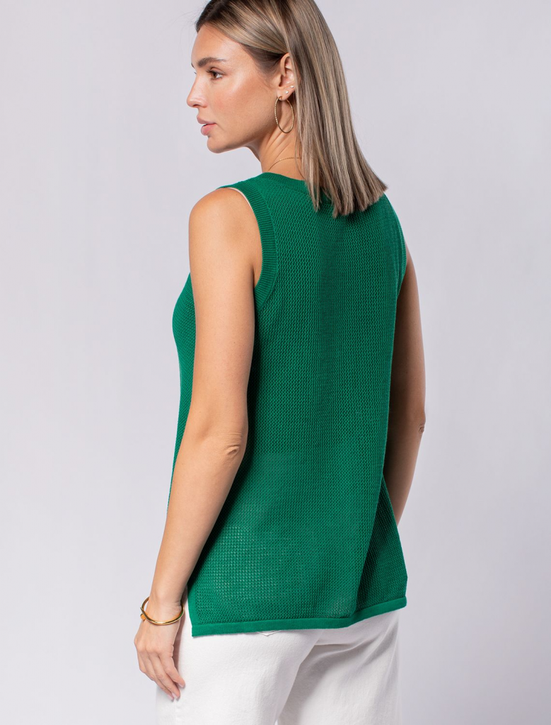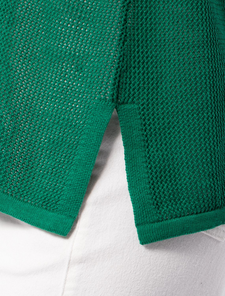 Летний топ полупрозрачной вязки выполнен из хлопковой пряжи. Идеально подойдет в жару, с мини-топом или в сочетании с купальником. Также отлично впишется в многослойные образы с джинсами и жакетом. Модель дополнена металлическим логотипом бренда.