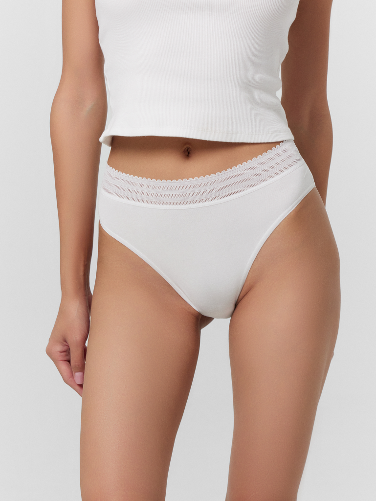 Слип-бикини из натурального хлопкового полотна – гипоаллергенного и приятного на ощупь. Линия талии завышена, бедра открыты. Верхний срез обработан декоративной тесьмой, по ножкам – жилка. Рекомендуем!