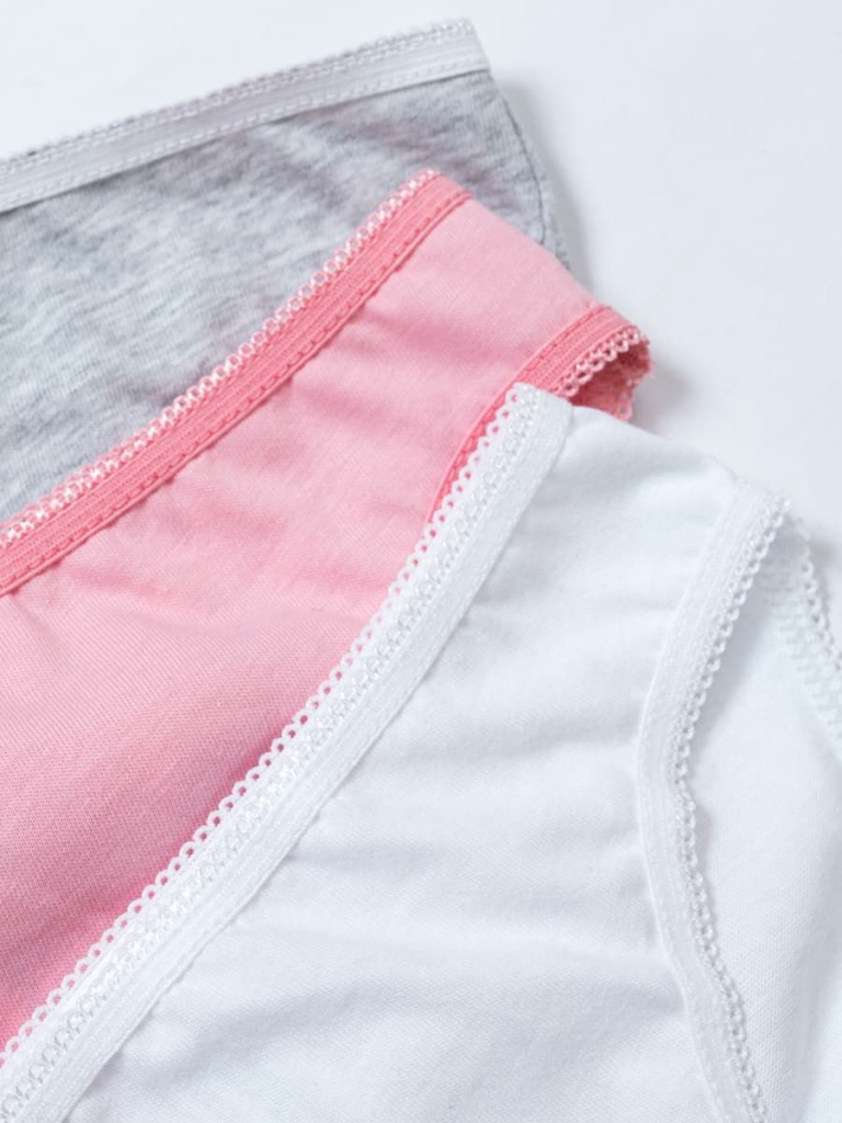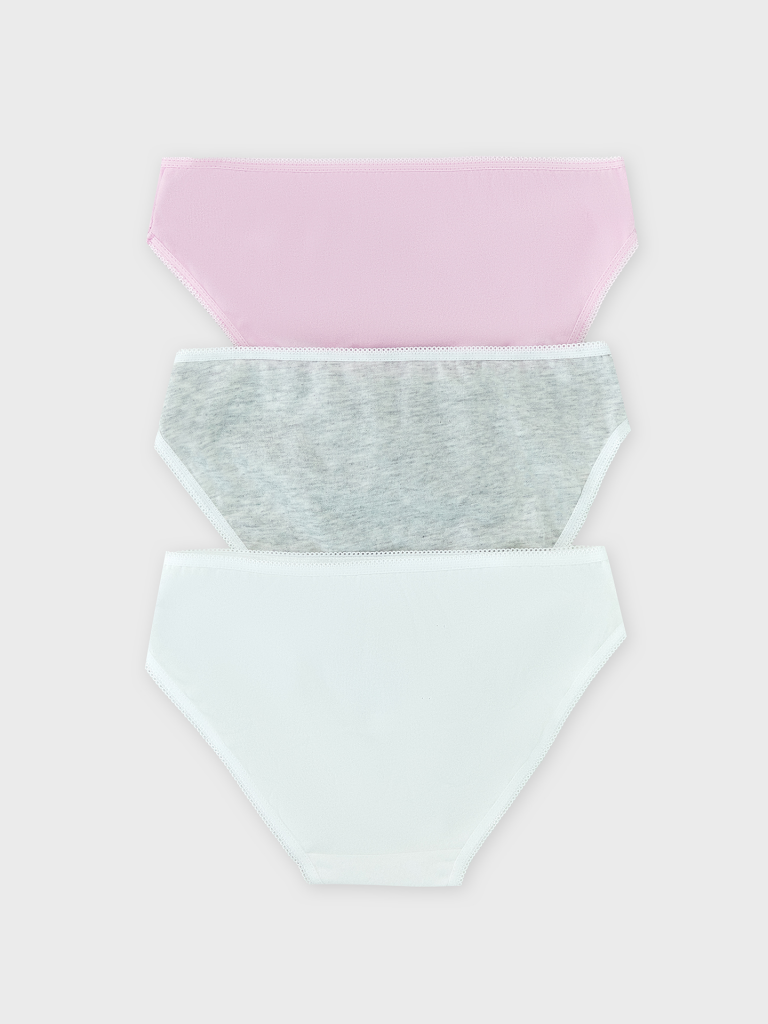 Мультипак (3 шт.) удобных трусиков из натурального хлопка. Особенностью модели является немного заниженная линия талии. Срезы декорированы ажурной тесьмой. Мило!