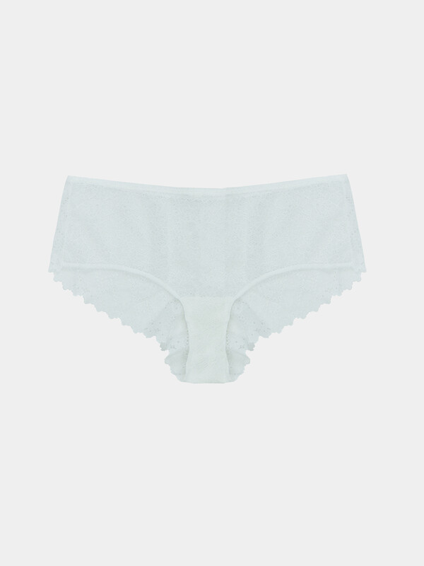 Трусы женские, средняя линия талии, шорты. Передняя деталь выполнена из кружевного полотна. Задние детали выполнены из кружева. Подкладка ластовицы из хлопка, отлетная по верхнему срезу. Верхний срез обработан тесьмой с зубом. Нижние срезы передней детали обработаны жилкой.