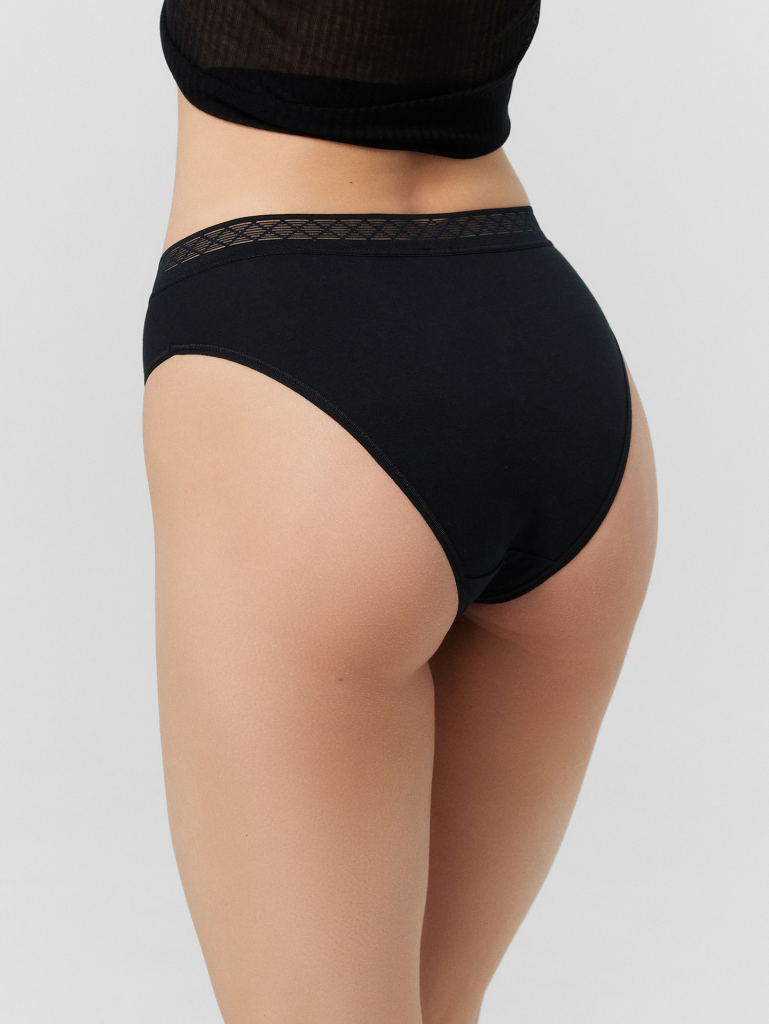 Слип-бикини из натурального хлопкового полотна – гипоаллергенного и приятного на ощупь. Линия талии завышена, бедра открыты. Верхний срез обработан декоративной тесьмой, по ножкам – жилка. Рекомендуем!