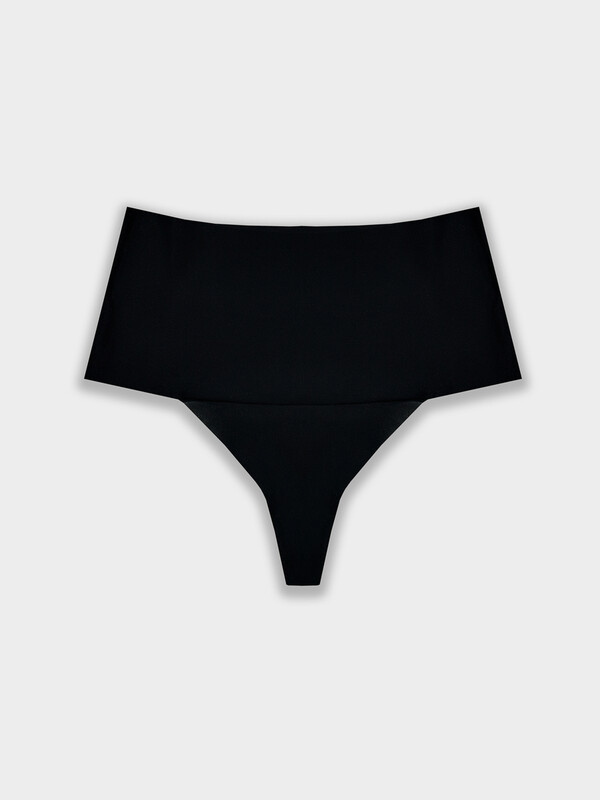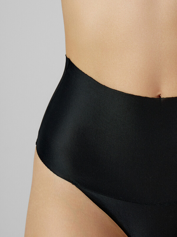 Трусы женские корректирующие, силуэт бразилиано с высокой линией талии и высокой линией ножек. Отрезные горизонтально на уровне линии ножек.Нижняя ластовица выполнена из кулирного полотна и отлетная по переднему краю. Верхние и нижние срезы не обработаны.