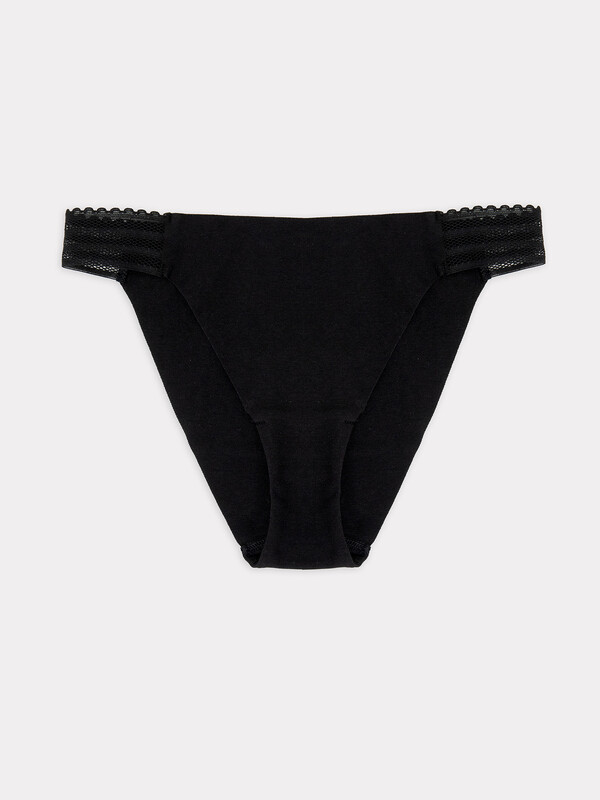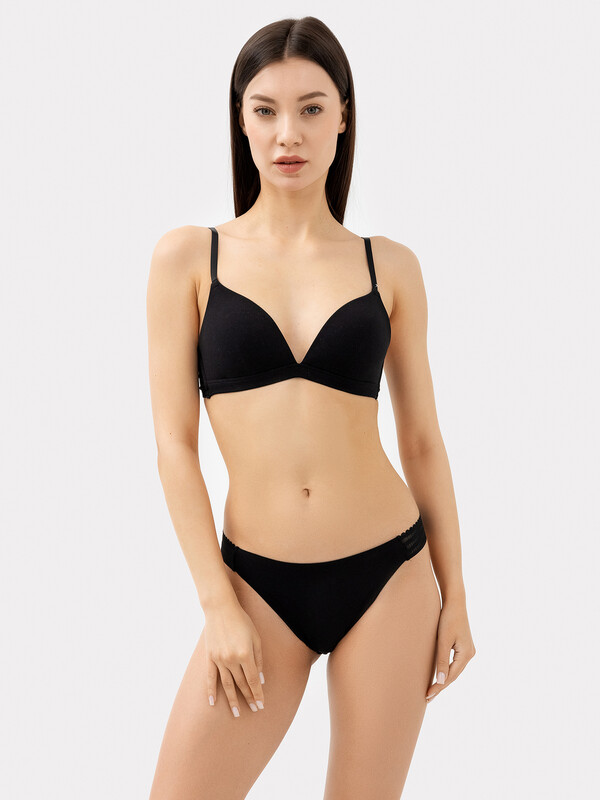 Трусы женские, средняя линия талии, силуэт-слипы. Передняя и задняя детали выполнены из интерлока. Подкладка ластовицы выполнена из кулирки, отлетная по переднему срезу. Боковые протяжки трусов выполнены из декоративной тесьмы.