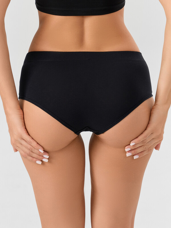 Черные трусы-шорты — элегантное и комфортное решение для повседневной носки. Модель со средней линией талии выполнена из мягкого трикотажа, который обеспечивает воздухообмен и комфортные тактильные ощущения. Цельные передняя и задняя детали создают гладкий силуэт без лишних швов, оставаясь незаметными под облегающей одеждой.