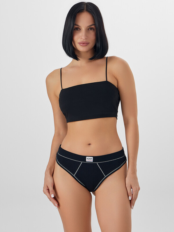 Трусы женские, средняя линия талии, силуэт - бразилиано. Передняя и задняя детали выполнены из рибаны. Верхний срез трусов обработан бейкой поперечной из рибаны, внутри жилка 6мм. Нижние срезы обработаны бейками поперечными из рибаны. Подкладка ластовицы из хлопка, верхний срез ластовицы притачан к детали из рибаны (с изнаночной стороны имитация мужского гульфика, с лицевой стороны декоративные строчки).