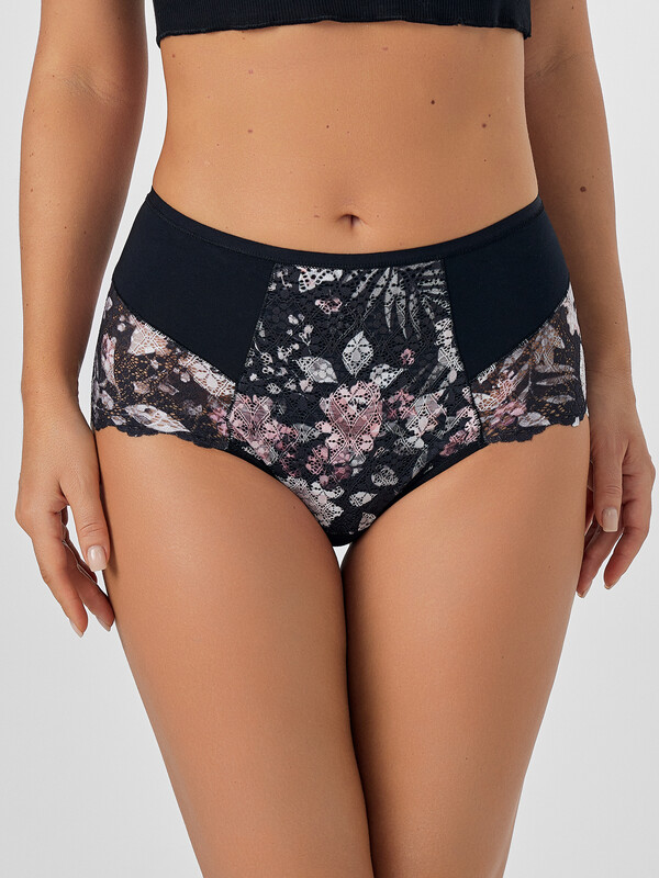 Трусы женские макси с высокой посадкой из кулирного полотна и эластичного кружева. Перед с вертикальным и горизонтальным членением. Передняя центральная деталь из кулирного полотна с наложением наверх эластичного кружева. Ластовица отрезная на подкладке из основного полотна. Срезы ластовицы обработаны эл тесьмой 6 мм (жилка тканая Wt4-6, девсел 13460 W) с наложением на лицевую сторону полотна и с узким верхним застилом в край. Задняя деталь со средним швом и с горизонтальным членением. Вертикальные и горизонтальные швы собраны на ширителе. Верхний срез обработан эластичной тесьмой 10 мм (жилка тканая Wt4-10, девсел 13460 W) с наложением на лицевую сторону полотна и с узким верхним застилом в край.