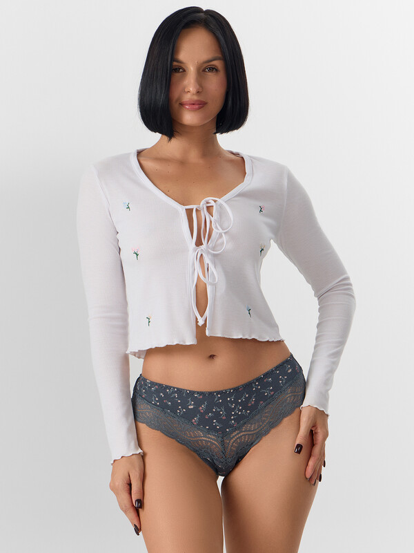 Трусы женские силуэта слип со средней посадкой из рибаны. По талии эластичная тесьма с зубом настрочена на 4-укольном зигзаге. Ножки обработаны узким кружевом шириной, на передней и задней частях со средним швом. Подкладка ластовицы из кулирной глади. Срезы ластовицы обработаны эластичной тесьмой с зубом на п/ш с изнаночной стороны.