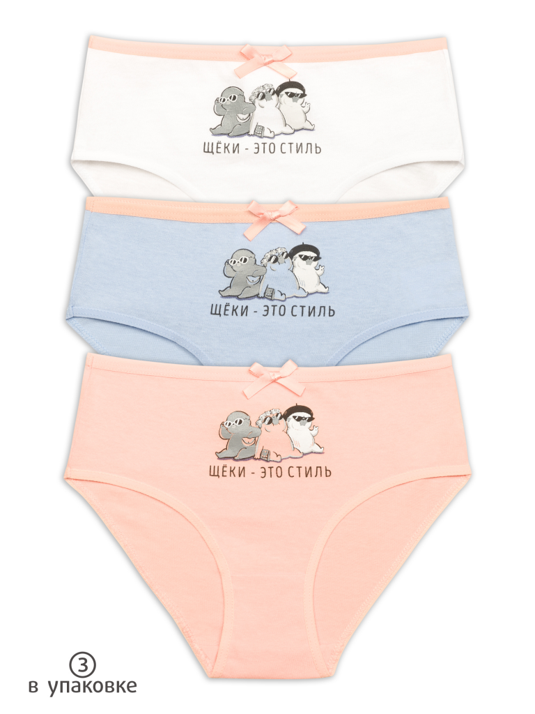 Трусики слипы с высокой посадкой для девочек. В комплекте 3 изделия. По талии эластик декорирован атласным бантиком. Обработка эластиком по ноге. Прочный принт.