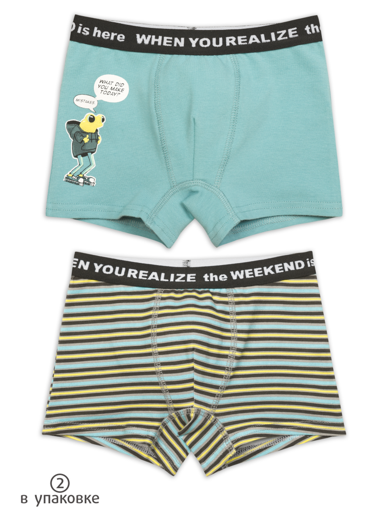 Трусы шорты для мальчиков. В комплекте 2 изделия. По талии широкий тканый эластик с вытканным вкруг текстом. Перевод Когда ты понимаешь, что выходной уже настал! Прочный принт. Перевод Ты что сегодня делал? ОШИБКИ. Декоративная обработка в области гульфика.