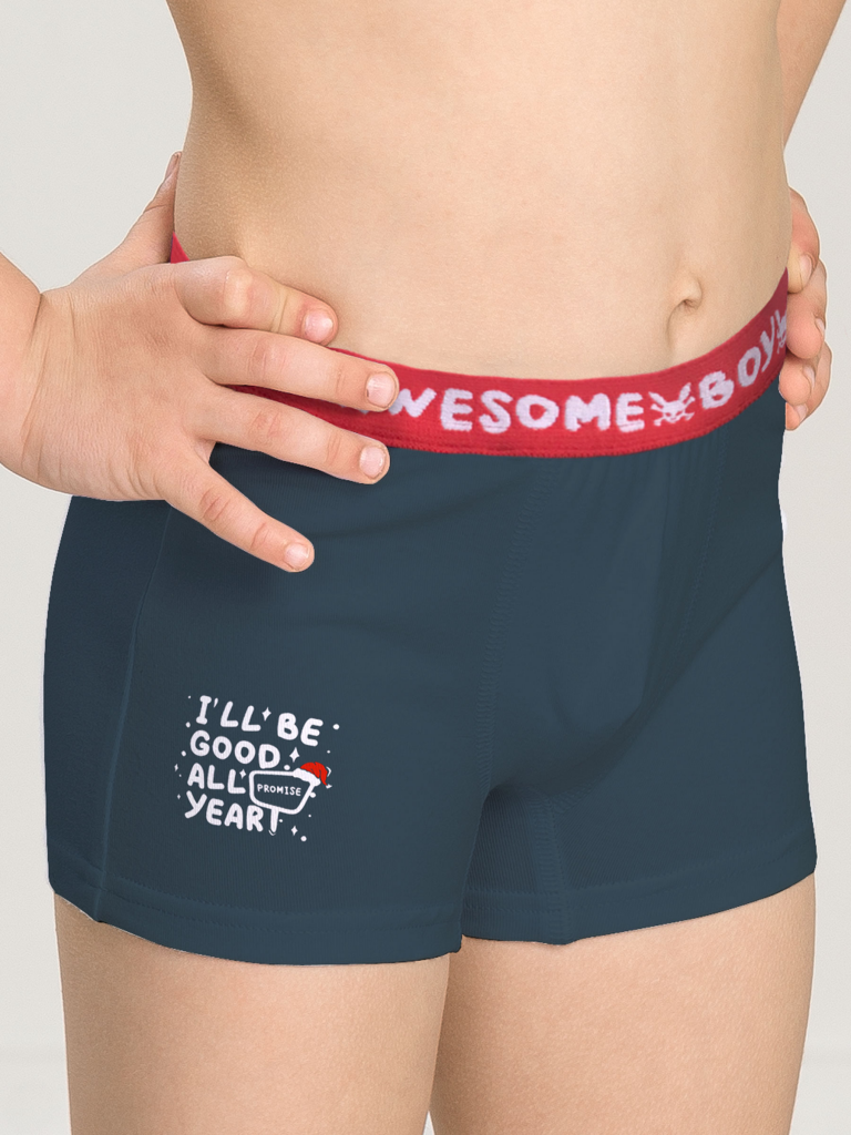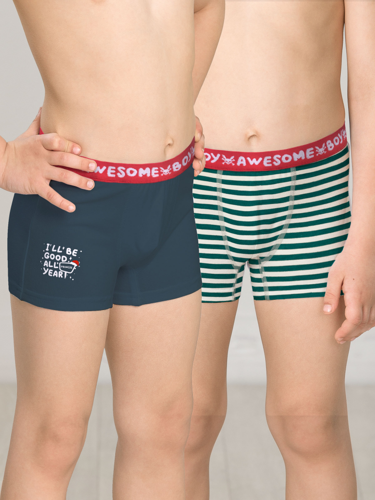Детские трусы шортики для мальчика, набор 2 штуки с новогодним принтом и надписью на резинке. Составляя детский гардероб, очень важно подобрать комфортные и удобные трусы для детей и подростков для повседневной носки на каждый день и сна. Детские трусы шорты для подростка с эластичной резинкой по талии надежно держатся на теле ребенка, не скручиваются, не закатываются и не сползают, а дышащая ткань позволяет избежать натирания нежной кожи. Добавление эластана делает трикотажные трусы боксеры эластичными и более удобными при надевании. Плотная, но свободная модель и средняя посадка не сковывают движения парня, что важно маленьким детям. Милое и практичное детское нижнее белье порадует родителей долговечностью. Хлопковые подростковые повседневные трусики шортики не боятся многочисленных стирок, не растянутся и не полиняют. Детская одежда для мальчиков должна отвечать моде, комплект трусы для малыша представляет только молодежные цвета, которые порадуют и поднимут настроение современному мальчику.