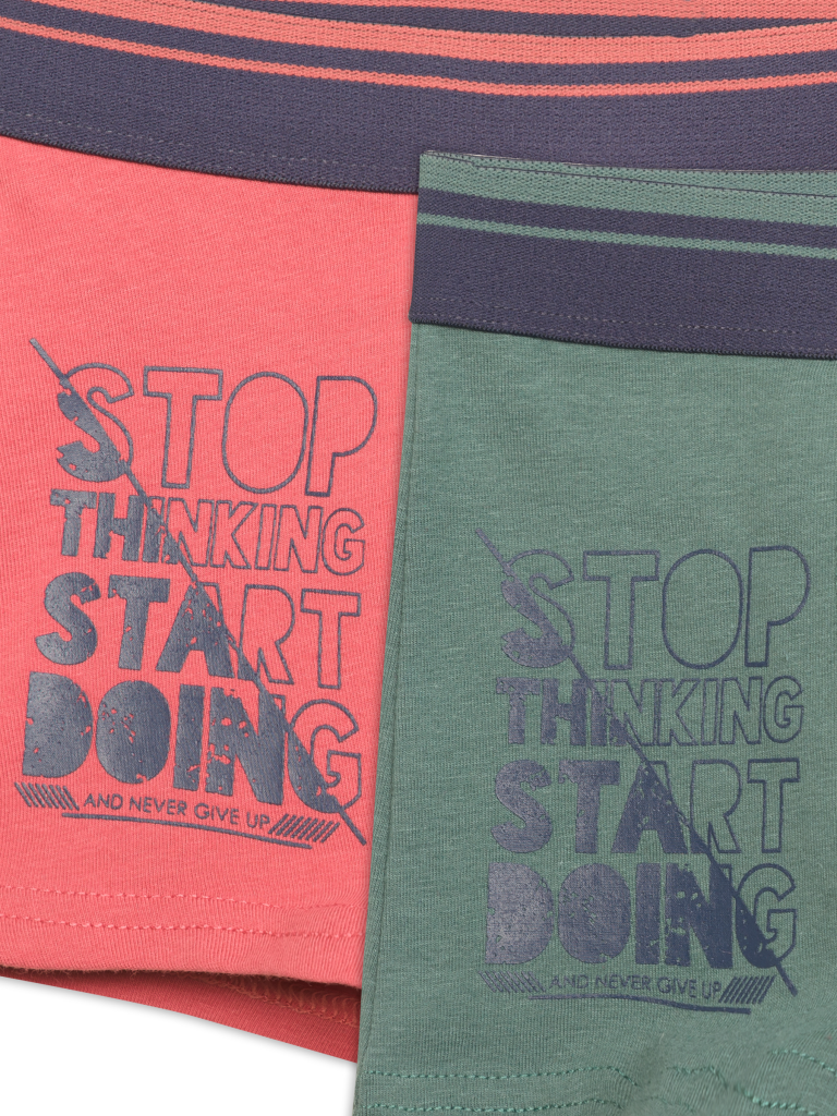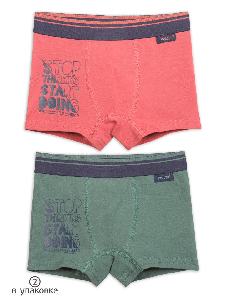 Трусы шорты для мальчиков. В комплекте 2 изделия. По талии широкий тканый эластик с полосками. Декоративная обработка в области гульфика. Прочный принт. Перевод Хватит думать, начинай делать.
