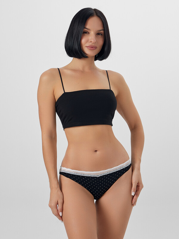 Трусы слипы женские черные — это нежная и комфортная модель для повседневной носки. Они выполнены из высококачественного хлопка, который мягко облегает тело, позволяет коже дышать и не вызывает раздражения. Заниженная линия талии обеспечивает удобную посадку без давления. Пояс украшен кружевом, что добавляет образу элегантности, а ластовица оформлена аккуратной складочкой для дополнительного комфорта.