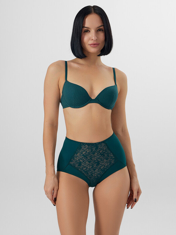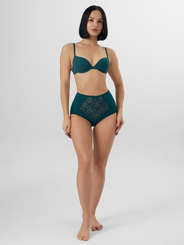 Трусы женские, силуэт макси, выполнены из трикотажного полотна микрофибра. Передняя деталь в центре декорирована кружевным полотном, на подкладке из монокапрона. Нижние детали переда двойные. Внутри по ножкам стоит эл тесьма 6мм (жилка Wt4-6, девсел 13460W). Подкладка ластовицы выполнена из кулирного полотна. Швы передних деталей, ластовицы обработаны на плоскошовной машине с верхним застилом. Срезы по ножкам зад. дет., ластовице обработаны эл. тесьмой с зубом 10мм (жесткая c/з WTE1-10 devsel 558W ) зигзагообразной строчкой. По верхнему срезу эл. тесьма 12мм (жесткая с/з WTE1-12, devsel 558W).