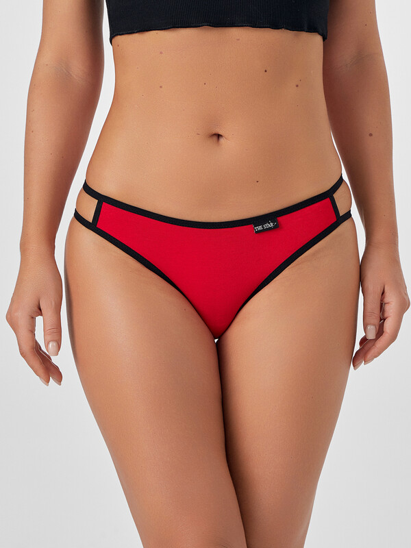 Трусы женские, силуэт слип, из трикотажного кулирного полотна, со средней посадкой, с протяжками по бочкам. Передняя и задняя детали цельные. Подкладка ластовицы из кулирной глади отлетная по переднему срезу. На бочках отверстия.