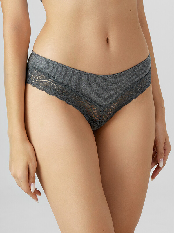 Трусы женские силуэта слип со средней посадкой из рибаны. По талии эластичная тесьма с зубом настрочена на 4-укольном зигзаге. Ножки обработаны узким кружевом шириной, на передней и задней частях со средним швом. Подкладка ластовицы из кулирной глади. Срезы ластовицы обработаны эластичной тесьмой с зубом на п/ш с изнаночной стороны.