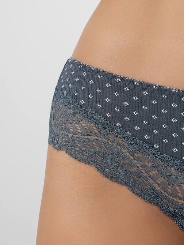 Трусы женские силуэта слип со средней посадкой из рибаны. По талии эластичная тесьма с зубом настрочена на 4-укольном зигзаге. Ножки обработаны узким кружевом шириной, на передней и задней частях со средним швом. Подкладка ластовицы из кулирной глади. Срезы ластовицы обработаны эластичной тесьмой с зубом на п/ш с изнаночной стороны.