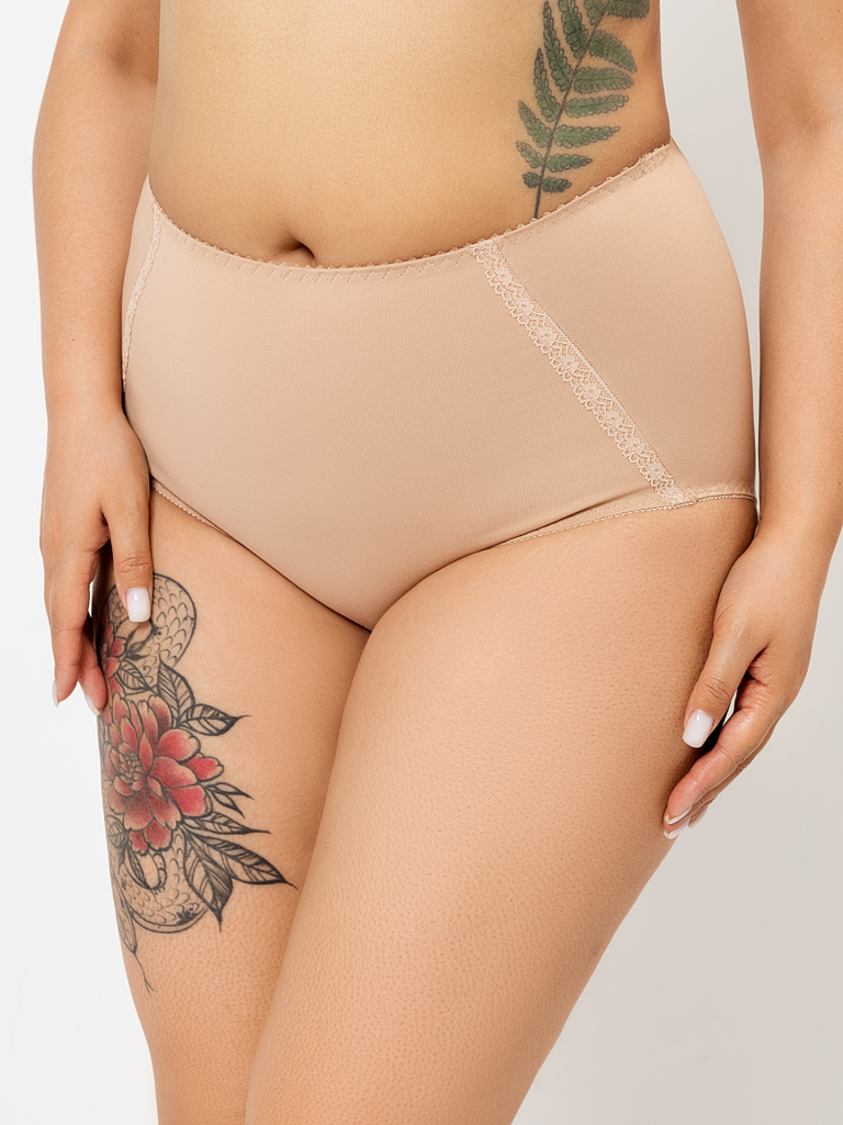 Корректирующие трусики с высокой посадкой, выполненные из великолепного хлопкового полотна с добавлением эластана. Деликатно утягивают проблемные зоны, формируя элегантный женственный силуэт. На поясе и по ножкам – эластичная тесьма. Шарма добавляют кружевные детали, а универсальности – базовая расцветка.