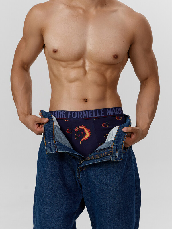 Прилегающие, без боковых швов. Планка с вытачкой. Задний шов ластовицы обработан строчкой «флэт-лок». По верхнему срезу настрочена фирменная жаккардовая эластичная тесьма (30 мм или 35 мм, по заданию) на 3-хигольной плоскошовной машине. Боковой срез тесьмы стачен строчкой «флэт-лок». Нижние срезы застрочены швом вподгику на плоскошовной машине.