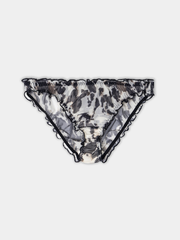 Трусы женские, силуэт - слипы, выполнены из трикотажного полотна сетки. Задняя и передняя деталь цельнокроеные. Подкладка ластовицы из кулирного полотна, отлетная по врхнему срезу. Верхние и нижние срезы обработаны закруткой, и собраны со сборкой на эл. тесьму 6мм (жилка Wt4-6, девсел 13460W) зигзагом.