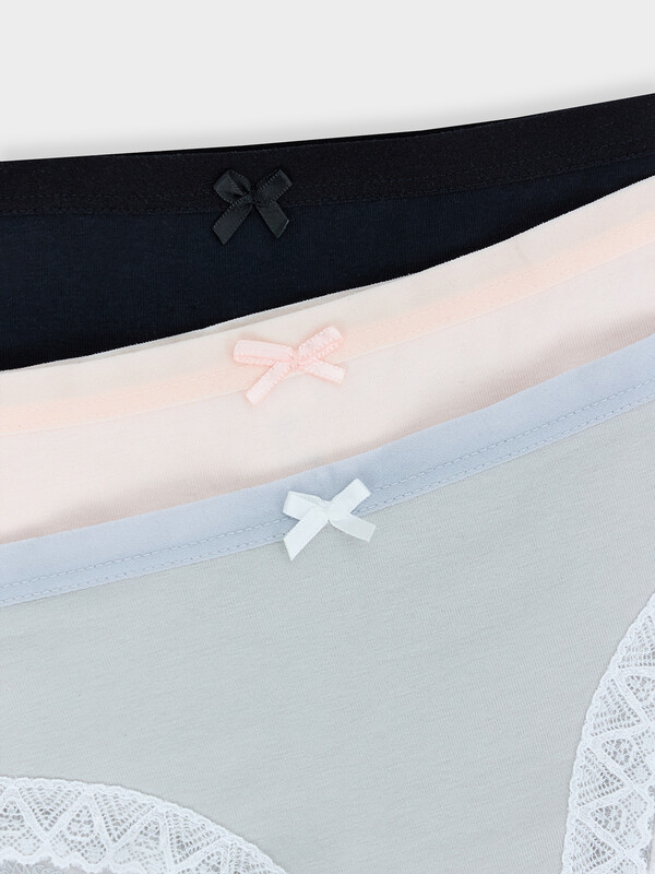 Мультипак (3 штуки) хлопковых слип-бикини из натурального, гипоаллергенного, дышащего полотна. Линия талии невысокая. По поясу и ножкам – нежная кружевная лента. Отличный повседневный вариант в базовой расцветке!