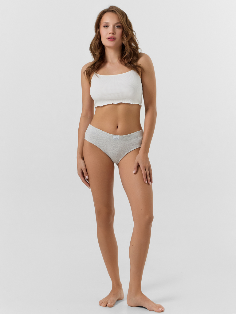Трусы женские, средняя линия талии, силуэт - слипы. Передняя и задняя детали выполнены из рибаны. Верхний срез трусов обработан бейкой поперечной из рибаны, внутри жилка 6мм. Нижние срезы обработаны бейками поперечными из рибаны. Подкладка ластовицы из хлопка, отлетная по верхнему срезу.