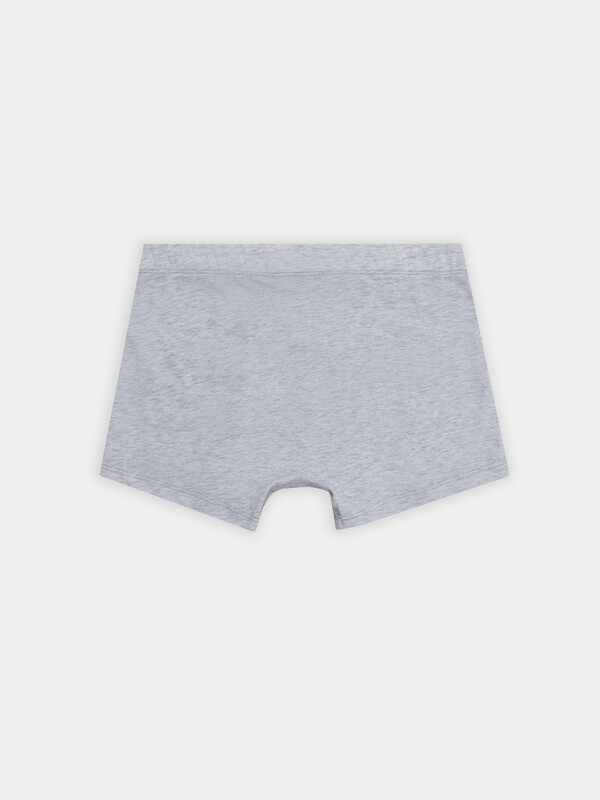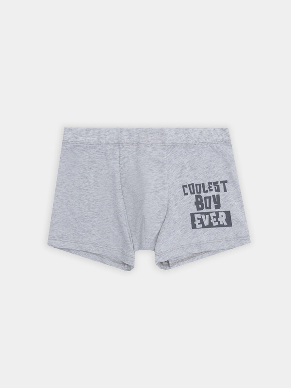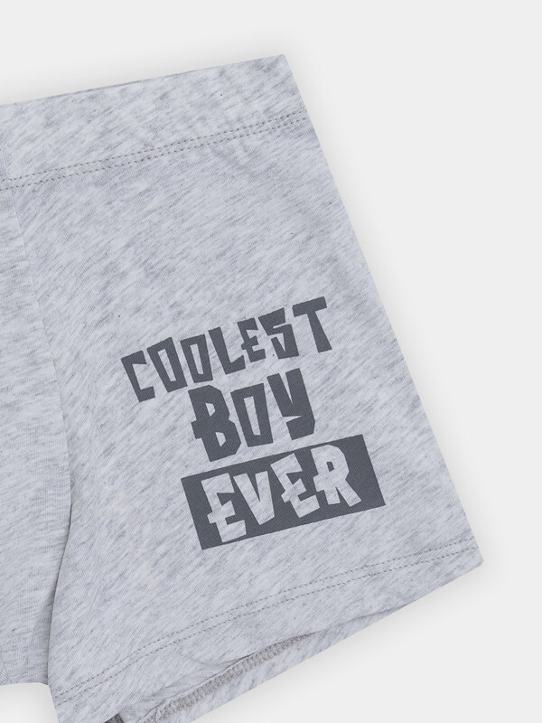 Серые трусы для мальчиков с мотивирующей надписью «Coolest boy ever» («Самый крутой парень на свете») — отличный выбор для повседневного гардероба. Модель прилегающего силуэта без боковых швов обеспечивает комфорт и не раздражает кожу. Планка с подкладкой и эластичная тесьма по верхнему срезу гарантируют удобную посадку, а аккуратная обработка низа добавляет изделию долговечности.