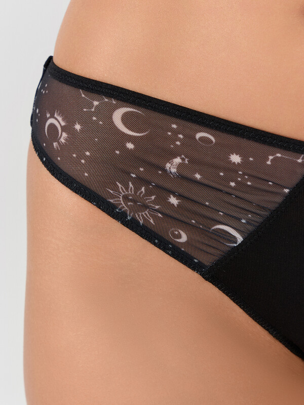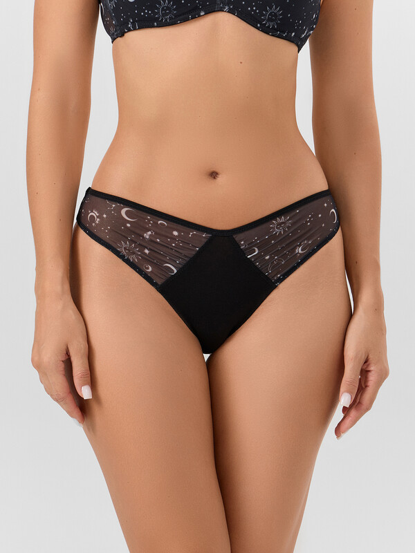 Задняя деталь из ажурной сетки с оригинальным декоративным элементом создает утонченный и притягательный образ. Эластичная тесьма по всем срезам обеспечивает идеальную посадку, а подкладка из хлопка заботится о комфорте в течение всего дня. Состав сбалансирован для практичности: хлопок обеспечивает воздухообмен, полиамид — износостойкость, эластан — идеальное облегание.