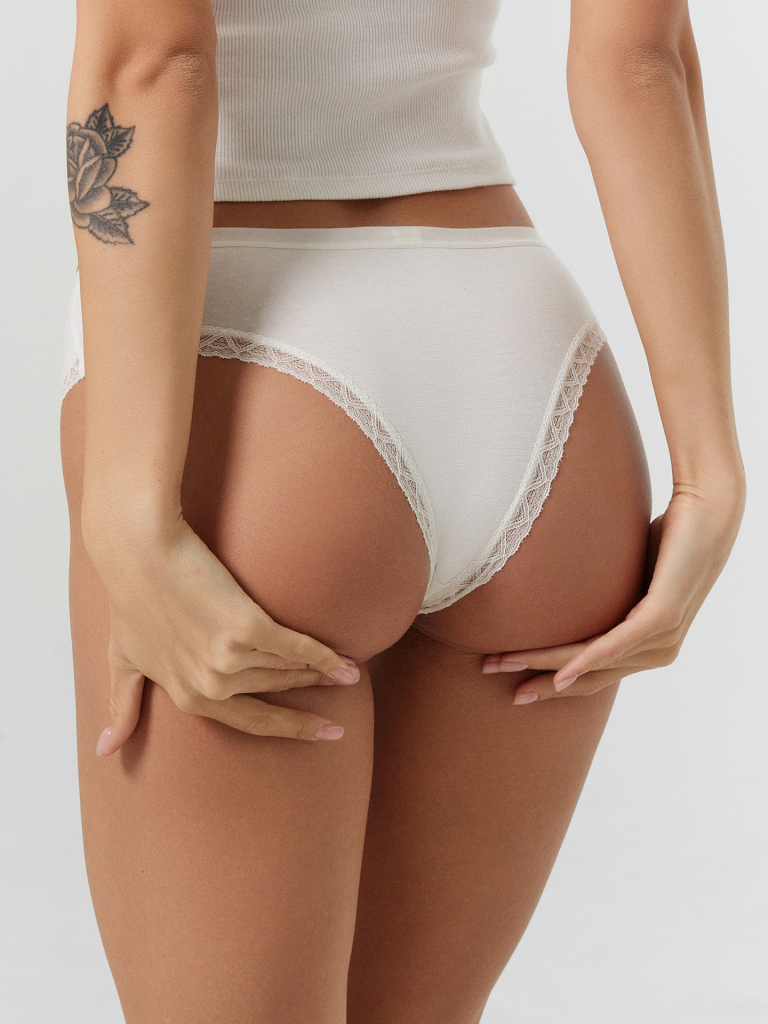 Мультипак (3 штуки) хлопковых слип-бикини из натурального, гипоаллергенного, дышащего полотна. Линия талии невысокая. По поясу и ножкам – нежная кружевная лента. Отличный повседневный вариант в базовой расцветке!