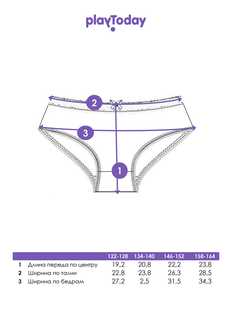 Классический набор базовых трусов с кружевами для девочки подростка от PlayToday — деликатный и комфортный комплект на каждый день. Такая модель сочетает в себе удобную посадку, дышащий материал и аккуратный кружевной декор, который делает образ немного нарядным, но остаётся уместным в повседневной носке.Преимущества модели:+ мягкий хлопковый трикотаж с эластаном+ анатомический крой+ кружевная отделка+ мягкая эластичная резинка+ гипоаллергенный состав+ универсальные расцветки: черный, белый+ 2 пары в комплекте+ легкий уходЭтот базовый комплект хлопковых подростковых трусов с кружевом для девочек создан с учётом анатомии подростка: модель хорошо садится по фигуре, мягко прилегает и не сковывает движений. Хлопок обеспечивает комфорт в течение всего дня — как в школе, так и на прогулке. Эластан в составе помогает белью не терять форму после многочисленных стирок.Кружево расположено по линии пояса — элегантно, но сдержанно: не мешает и не колется. Такие универсальные трикотажные трусы для подростков с кружевной отделкой помогут девочке чувствовать себя не только удобно, но и уверенно.Совет по уходу: машинная стирка при температуре до 30°C. Классические детские трусы для школьницы быстро сохнут, не растягиваются и остаются мягкими даже после многократного использования.Модель представлена на рост 134-164 см — идеально подходит для девочек от 9 до 15 лет.Модный набор трусов с кружевами для девочки от PlayToday — это нежность, комфорт и уверенность каждый день. Практичное и красивое решение для школьного и повседневного гардероба.