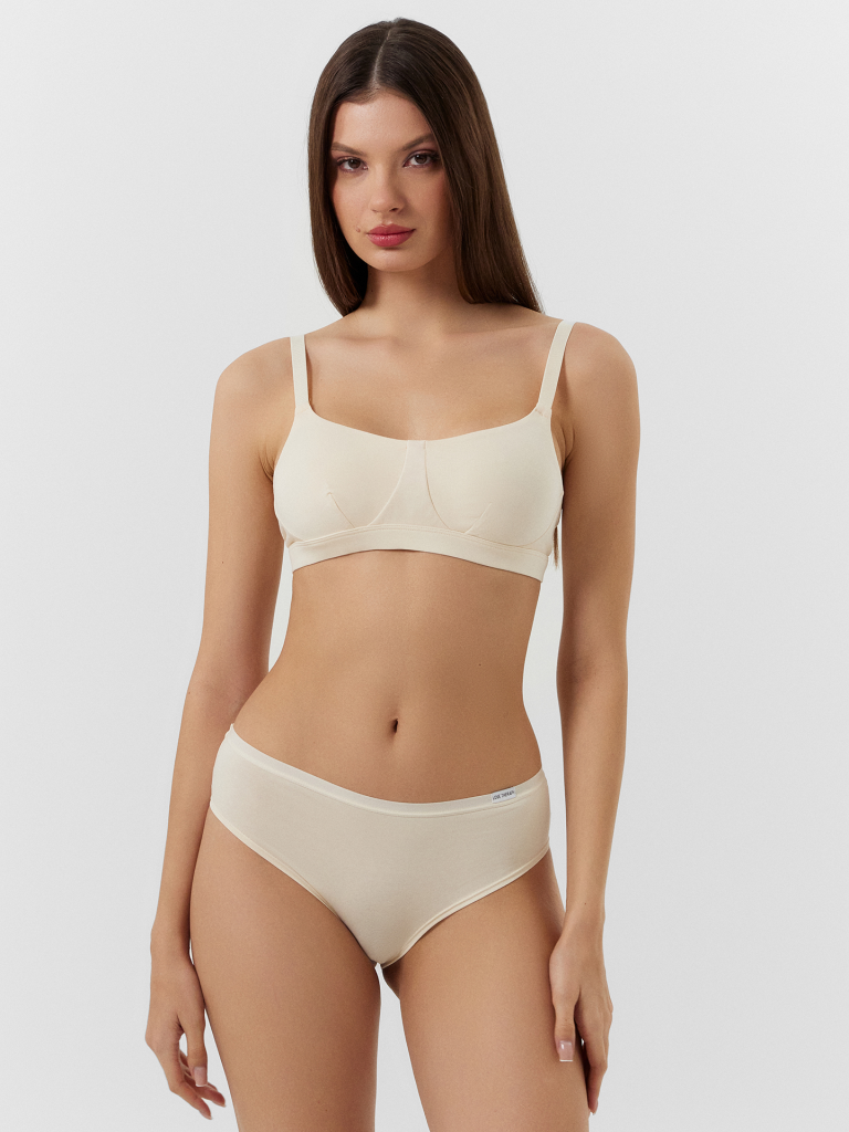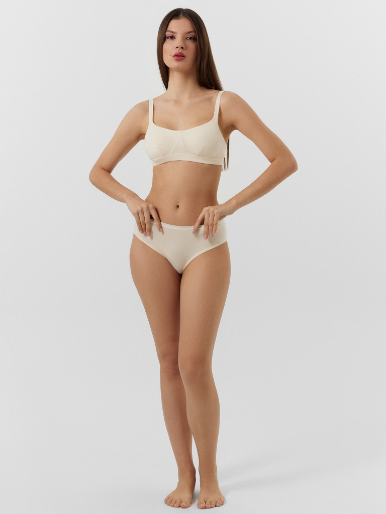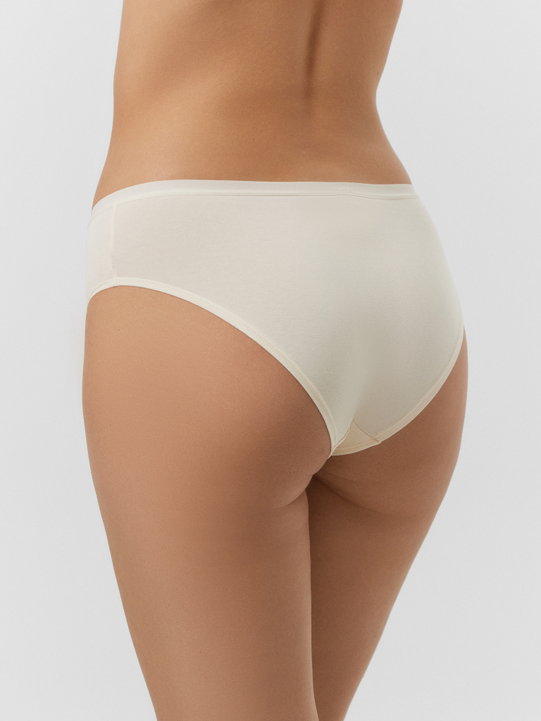 Трусы женские, классического силуэта из кулирного полотна, со средней посадкой. Передняя и задняя детали трусов цельные. Подкладка ластовицы из кулирного полотна, отлетная по переднему срезу. Нижние срезы обработаны на плоскошовной двухигольной машине. Верхний край трусов обработан эластичной тесьмой 15 мм ( тканая жилка, девсел 13195W) на плоскошовной двухигольной машине.
