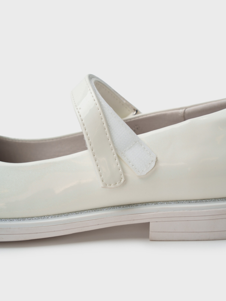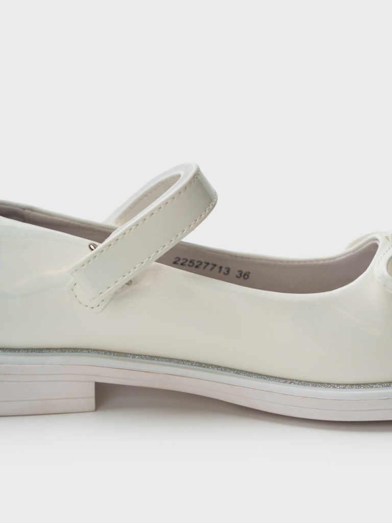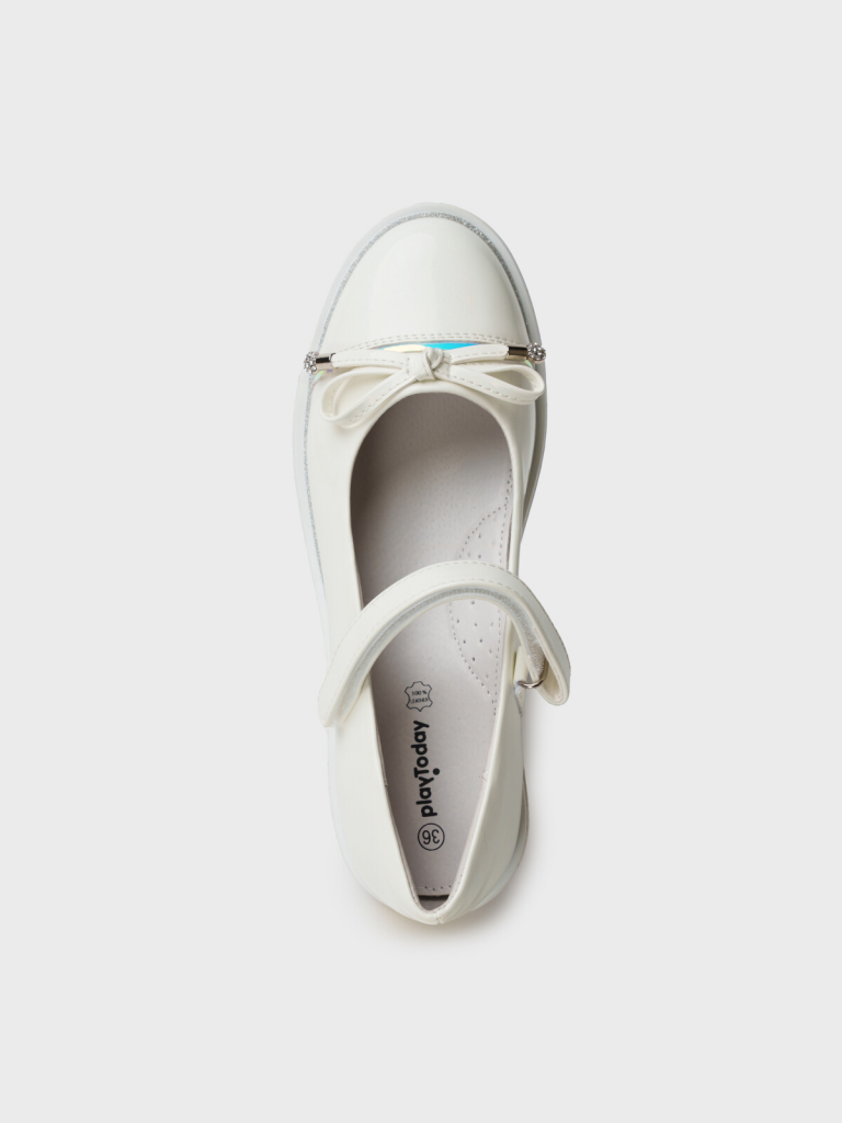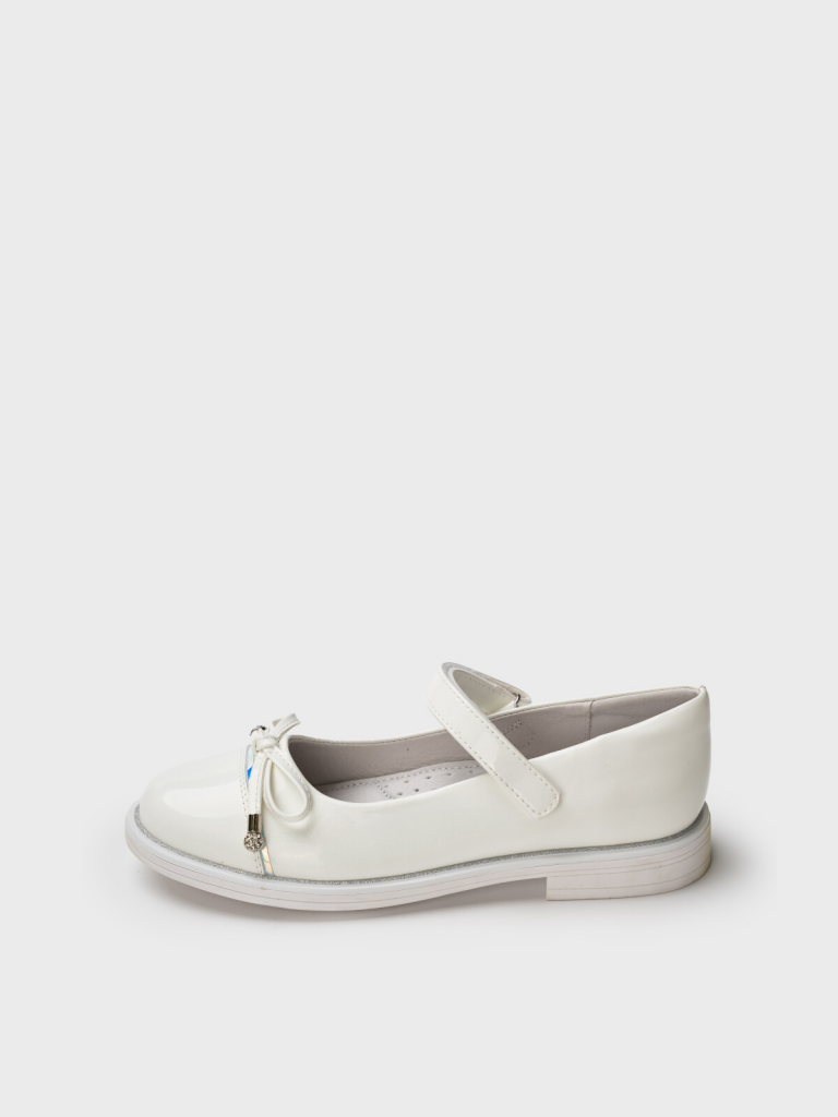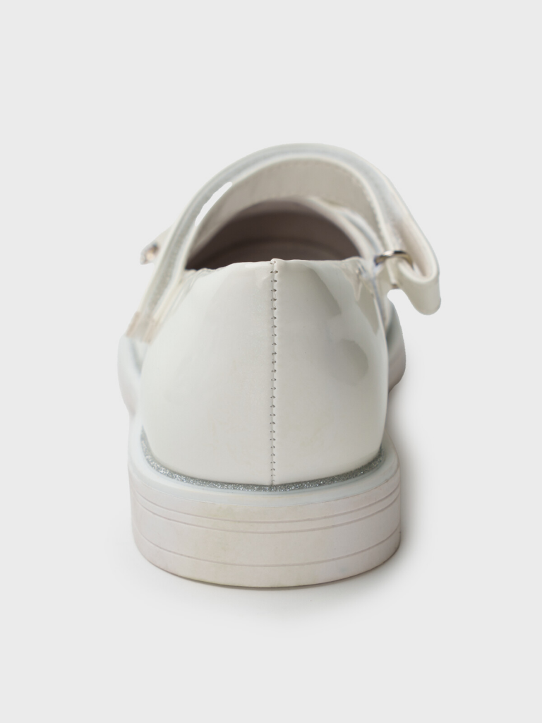 Школьные туфли для девочки подростка. Туфли выполнены из искусственной лаковой кожи. Возвратный чересподъемный ремень на липучке дает возможность регулировать обувь на любой подъем. Нарядные туфли украшены декоративным бантом. Декоративный рант с глитером. Подкладка выполнена из 100% натуральная кожа. Кожаная стелька с анатомическим элементом обеспечивает правильную нагрузку на стопу. Высота каблука 2 см - очень комфортная для повседневной носки. Формоустойчивый задник поддерживает стопу в правильном положении. Подошва легкая и гибкая. Белые лаковые туфли для девочки школьницы отлично подойдут как сменка в школу, на 1 сентября, для праздника, а также для прогулок: весна, лето, ранняя осень.