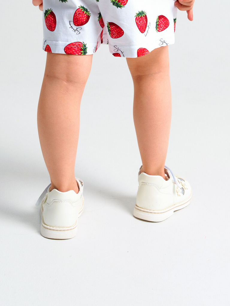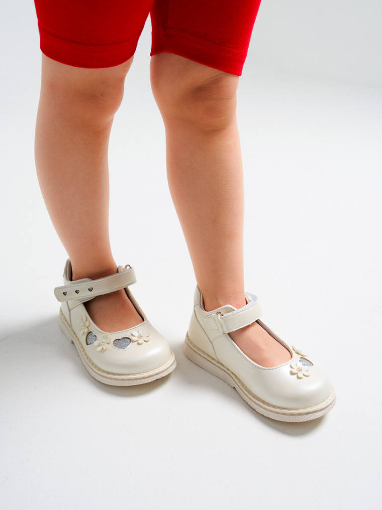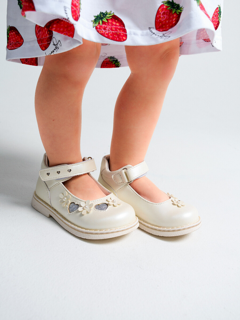 Туфли из искусственной кожи и украшены объемными цветочками. Ремешок с липучкой надежно фиксирует стопу ребенка. Подкладка и стелька выполнена из натуральной кожи. Стелька с анатомической формой способствует равномерному распределению давления и препятствует развитию плоскостопия. Эргономичная форма колодки обеспечивает правильное формирование стопы ребенка. Подошва из терморезины гибкая, лёгкая и не скользит.