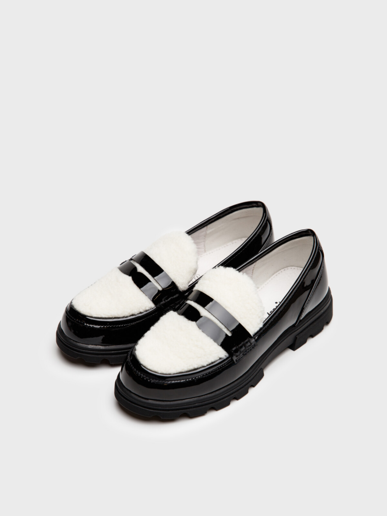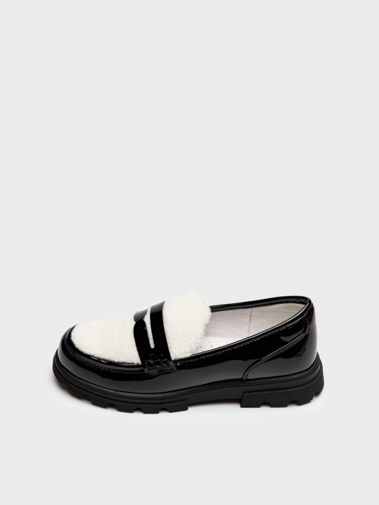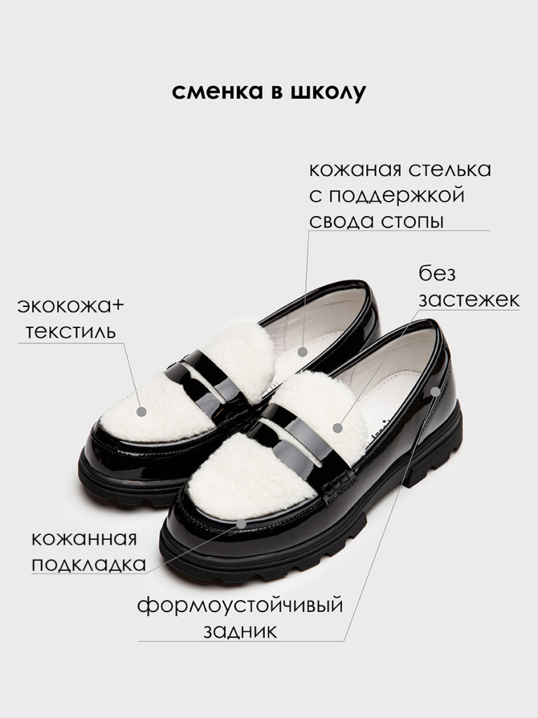 Модные туфли-лоферы для девочки подростка. Школьные лоферы выполнены из лаковой искусственной кожи с отделкой из искусственного меха. Подкладка - 100% натуральная кожа. Кожаная стелька с анатомическим элементом обеспечивает правильную нагрузку на стопу школьницы. Формоустойчивый задник поддерживает стопу в правильном положении. Подошва не скользит и устойчива к истиранию. Лоферы отлично подойдут как сменка в школу и для прогулок: весна, осень.