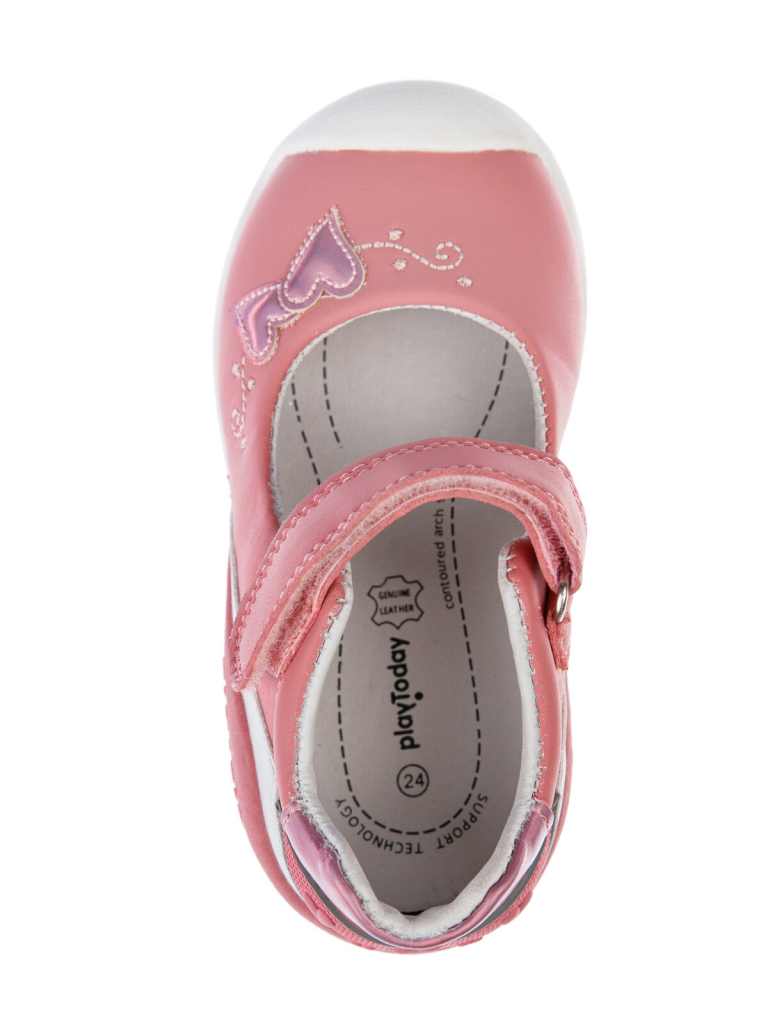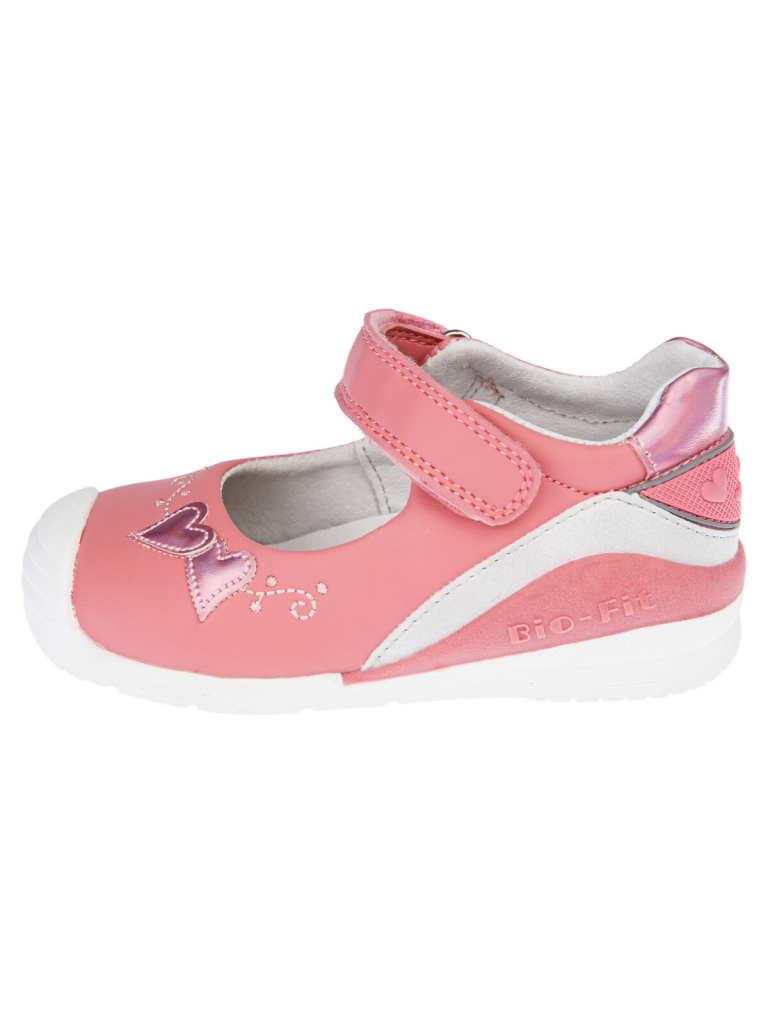 Туфли-сандалии из искусственной кожи. Подкладка выполнена из натуральной кожи. Стелька из натуральной кожи с анатомическим элементом поддерживает свод стопы в правильном положении. В модели использованы BIO-FIT технологии для правильного формирования стопы ребенка: стабилизация, дышащий антибактериальный материал для основания стельки, подошва с амортизирующими элементами для равномерного распределения нагрузки. Материал подошвы парфюмирован запахом жевательной резинки.