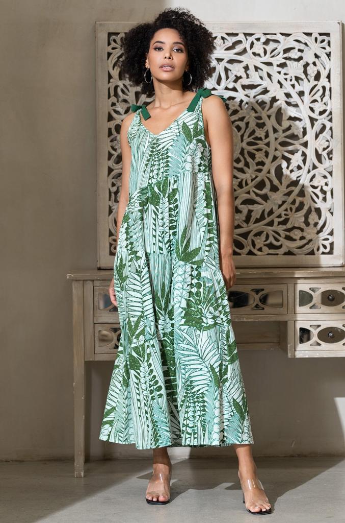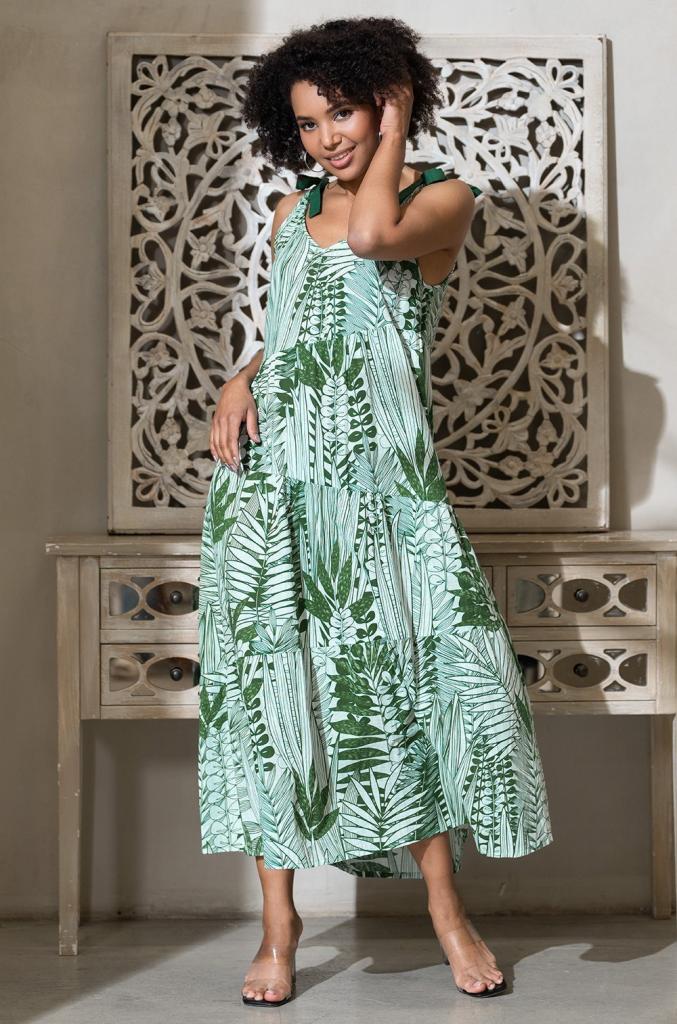 Длинный многоярусный сарафан Mia-Amore на бретелях, свободного силуэта. Изделие выполнено из принтованного натурального материала с однотонной отделкой.