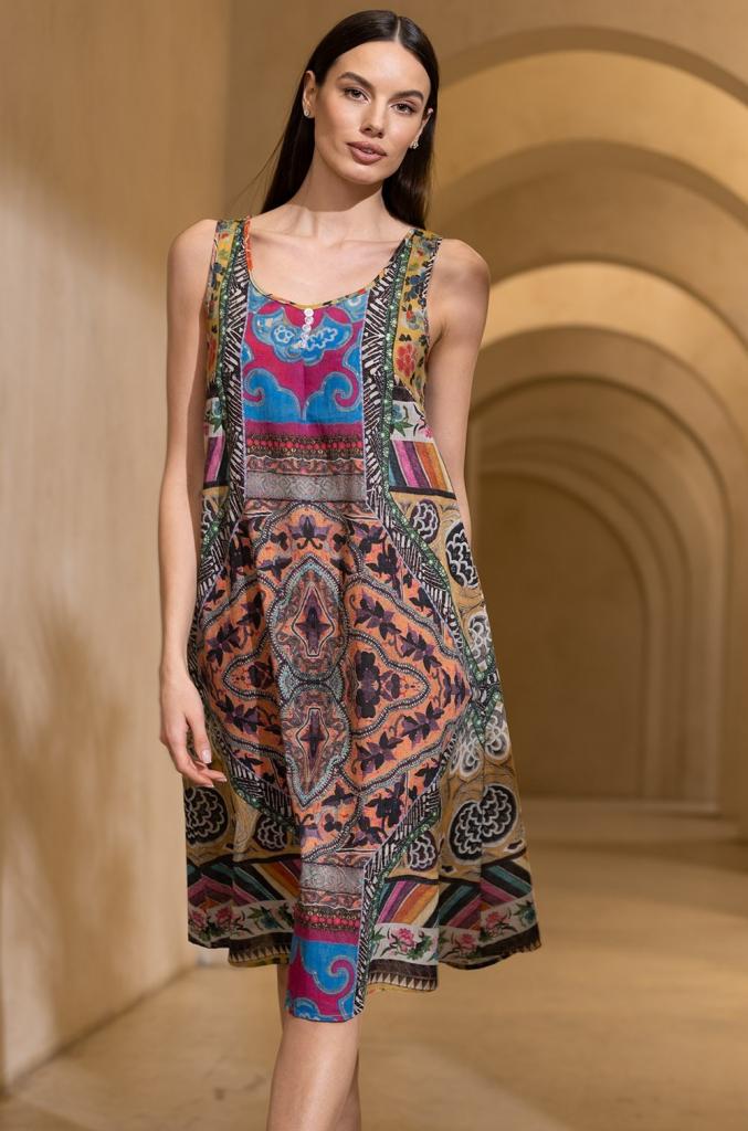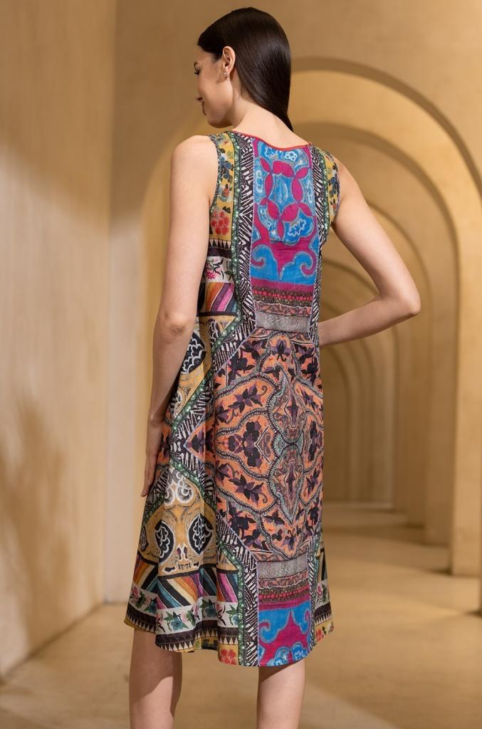 Туника Mia-Amore средней длинны без рукавов, выполнена из принтованной смесовой ткани хлопка со льном.
