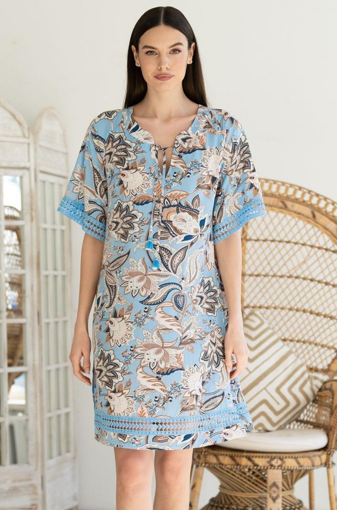Туника Mia-Amore длиной чуть выше колен, свободного силуэта с коротким рукавом. Изделие выполнено из тканой принтованной вискозы. Ажурная хлопковая тесьма украшает низ рукавов и низ изделия. По бокам обработаны карманы. По низу туники расположены разрезы. Вырез можно регулировать за счет завязок, на концах которых расположены кисточки. Линию талии можно подчеркнуть за счет пояса, который идет в комплекте.