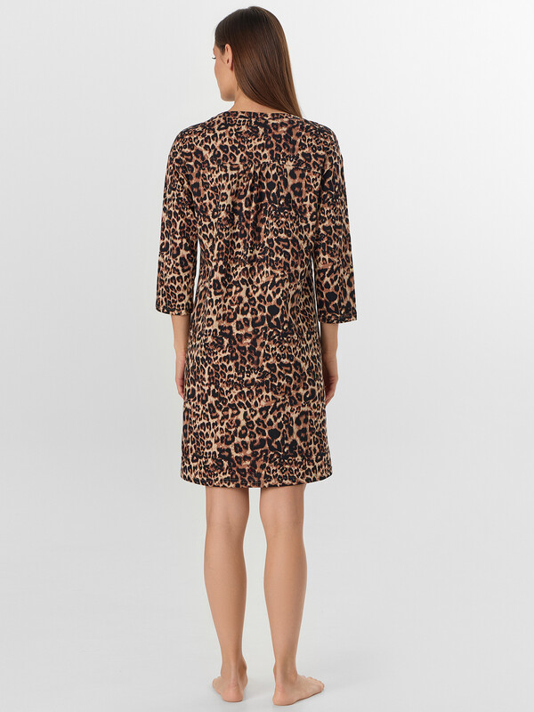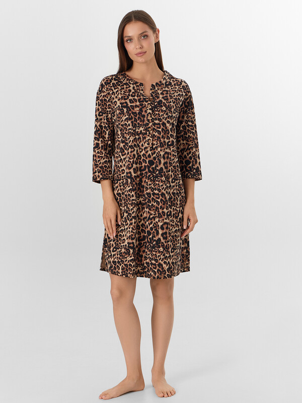 Яркий леопардовый принт придает образу стильную изюминку, сохраняя спокойную цветовую гамму. Универсальная туника подойдет для утреннего кофе, вечернего чтения или спокойного сна, даря чувство уюта и расслабления в любой домашней обстановке.