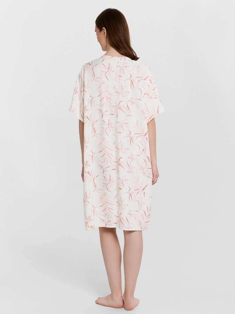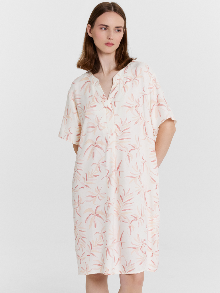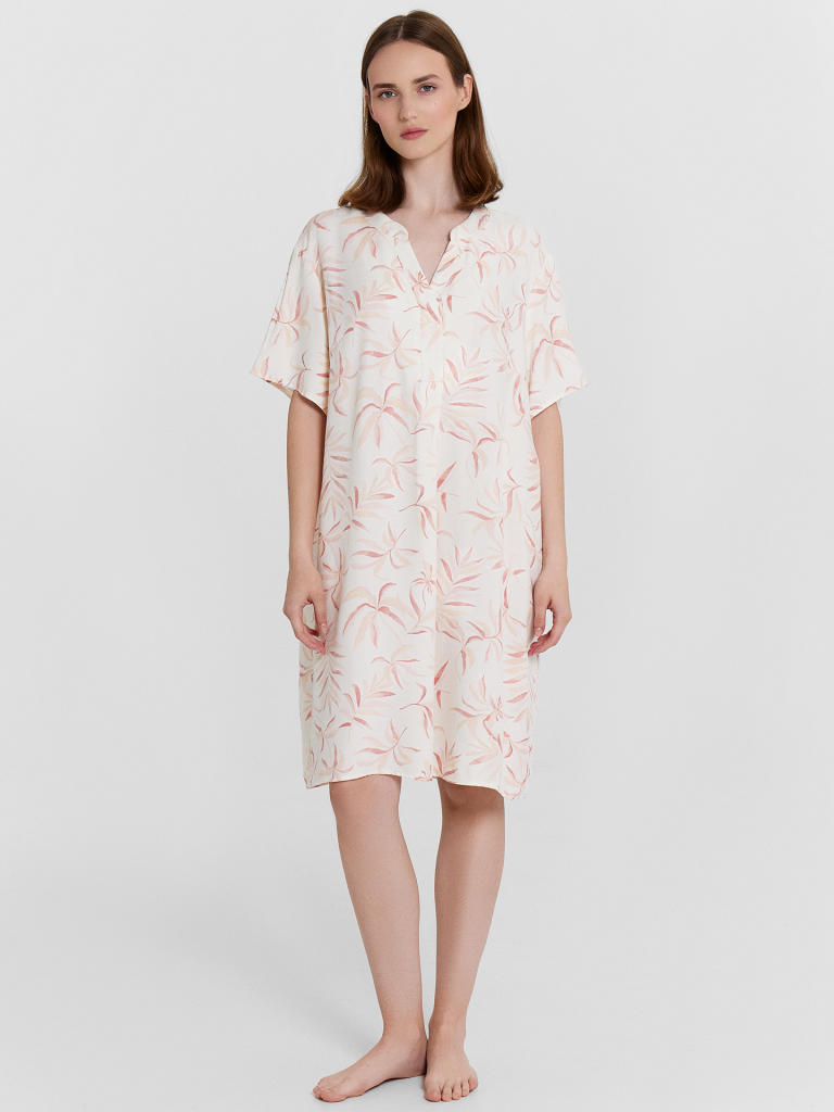 Туника женская прямого силуэта. Разрез переда обработан притачными планками с закрепкой. Горловина круглой формы, с притачной стойкой. Рукава короткие. Нижние срезы застрочены в подгибку . Низ туники обработан швом вподгибку.