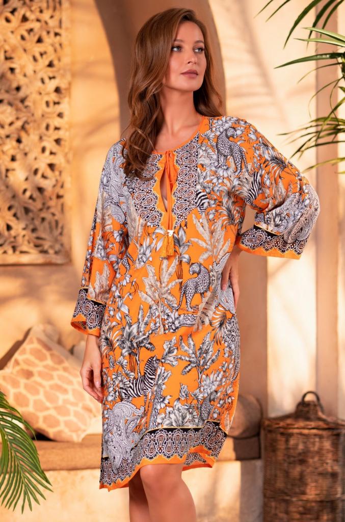 Туника Mia-Amore диной до колен выполнена из принтованной вискозы. Удлиненные рукава защитят от солнца. Горловина декорирована вырезом с декоративными наконечниками в виде гепардов. По бокам туники разрезы и внутренние карманы.